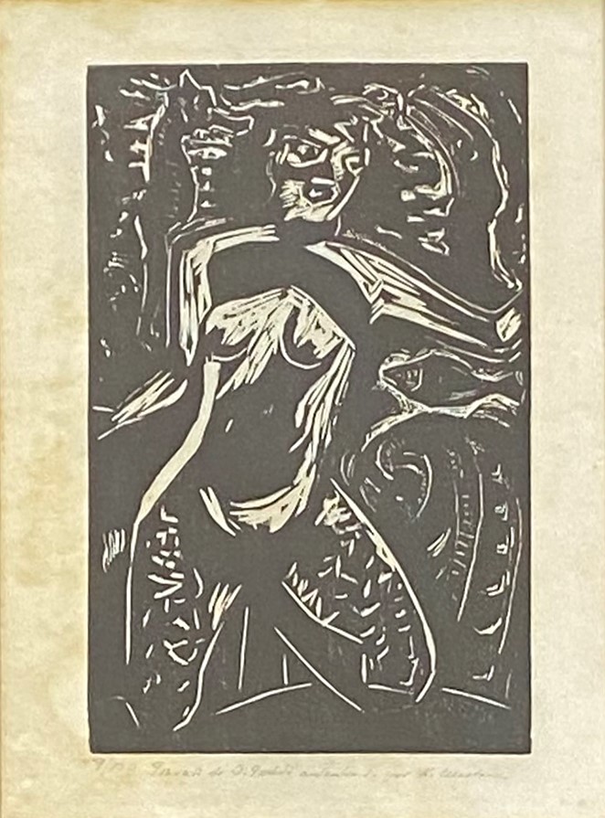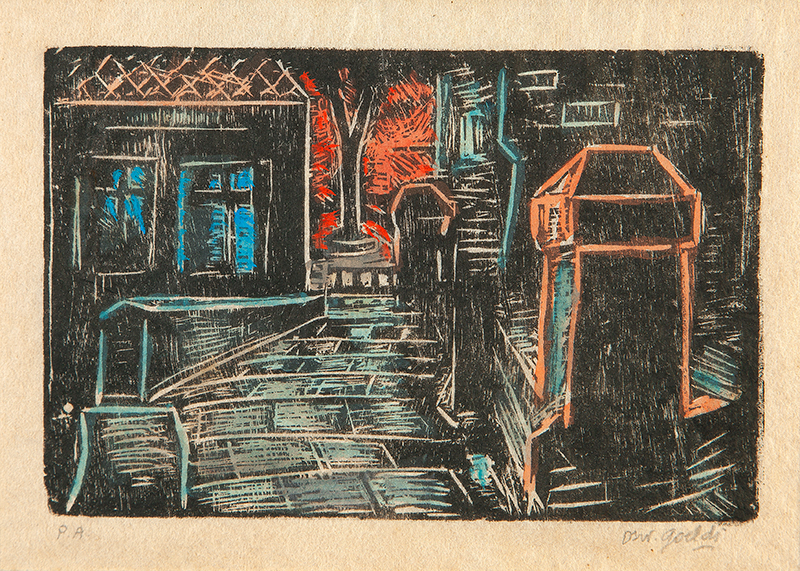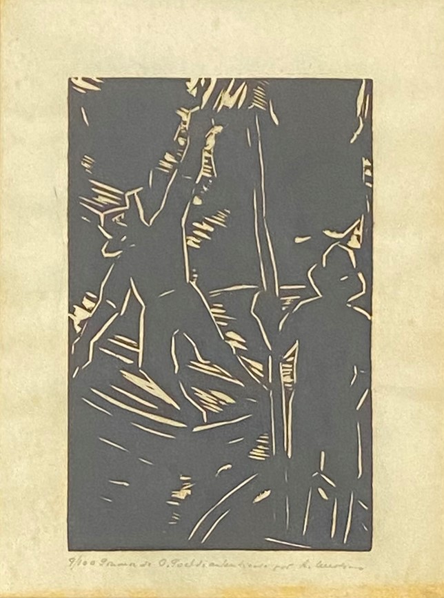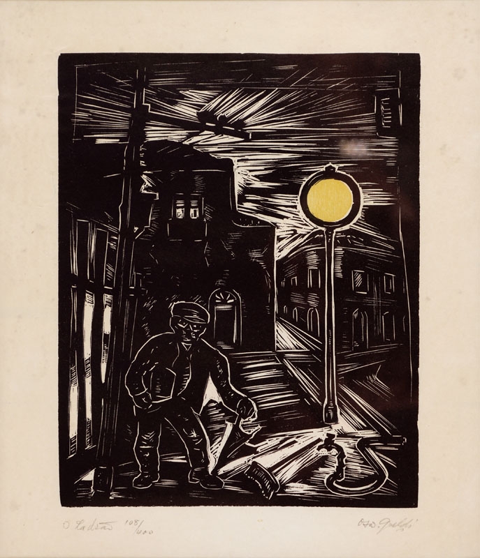 Oswaldo Goeldi - Estrada - Xilogravura - 2/12 - Assinado canto inferior direito - 30 x 42 cm. Exemplar reproduzido no catálogo da exposição "Goeldi - O encantador das sombras", Centro Cultural Correios, Rio de Janeiro, 2010, pág. 25. Exemplar reproduzido no catálogo da exposição "Oswaldo Goeldi - Soturno Caminhante",exposição itinerante, 2013, pág. 22. Moldura executada por Tenreiro Móveis e Decorações, selo no verso.