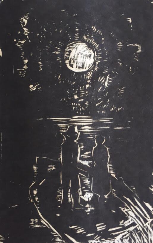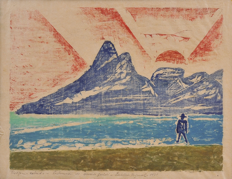 Oswaldo Goeldi - Sol - c.1957 - Xilogravura em cores sobre papel - 2/12 - Assinado canto inferior direito - 26 x 35 cm. Exemplar premiado na "II Bienal Internacional do México", 1960. Exemplar reproduzido no catálogo da exposição“Goeldi na BM&F - Arte em Preto e Branco”, Espaço Cultural BM&F, 2007, pág. 22. Exemplar reproduzido no catálogo da exposição "Oswaldo Goeldi - Soturno Caminhante", exposição itinerante, 2013, pág. 27. Moldura executada por Tenreiro Móveis e Decorações.