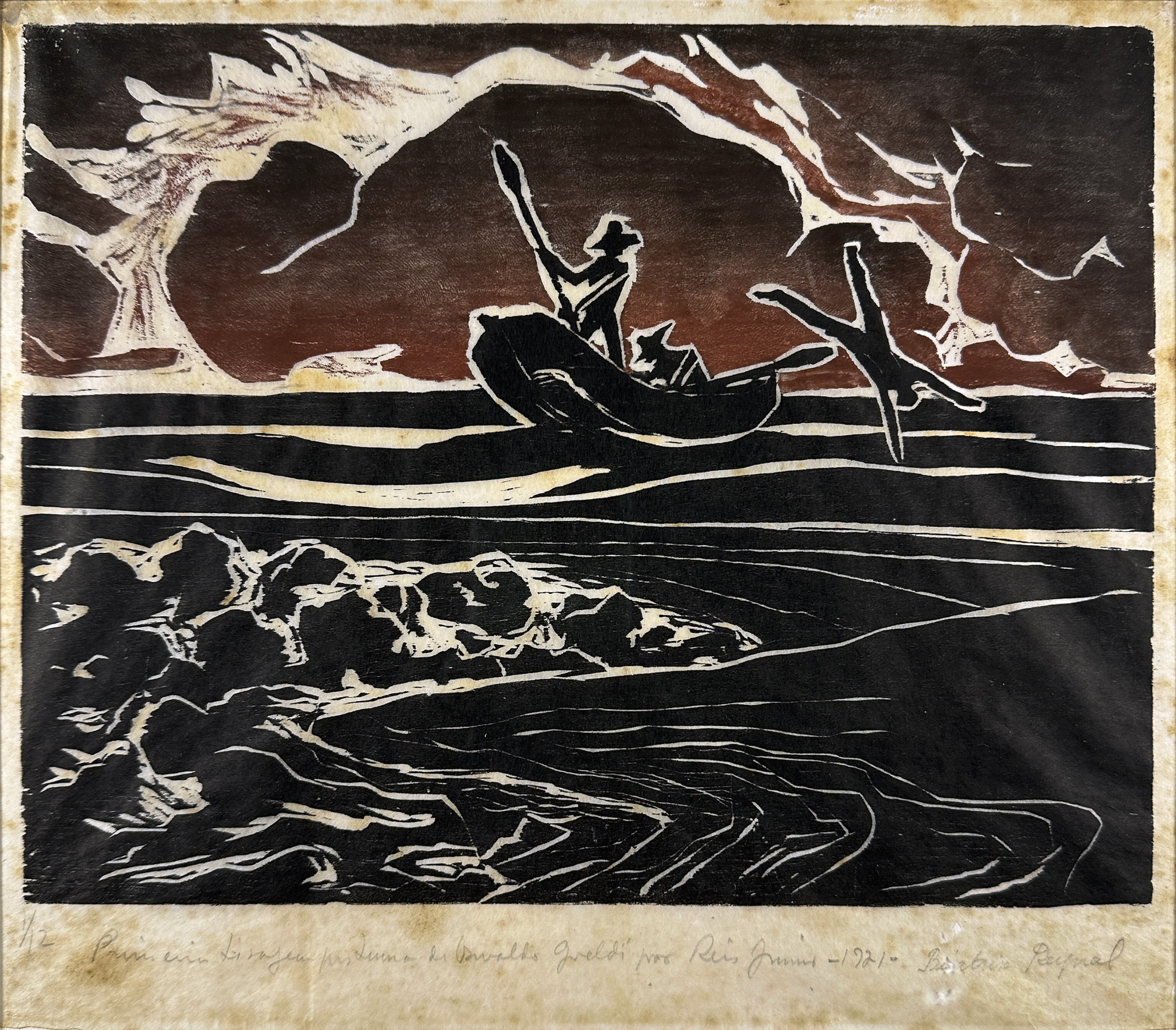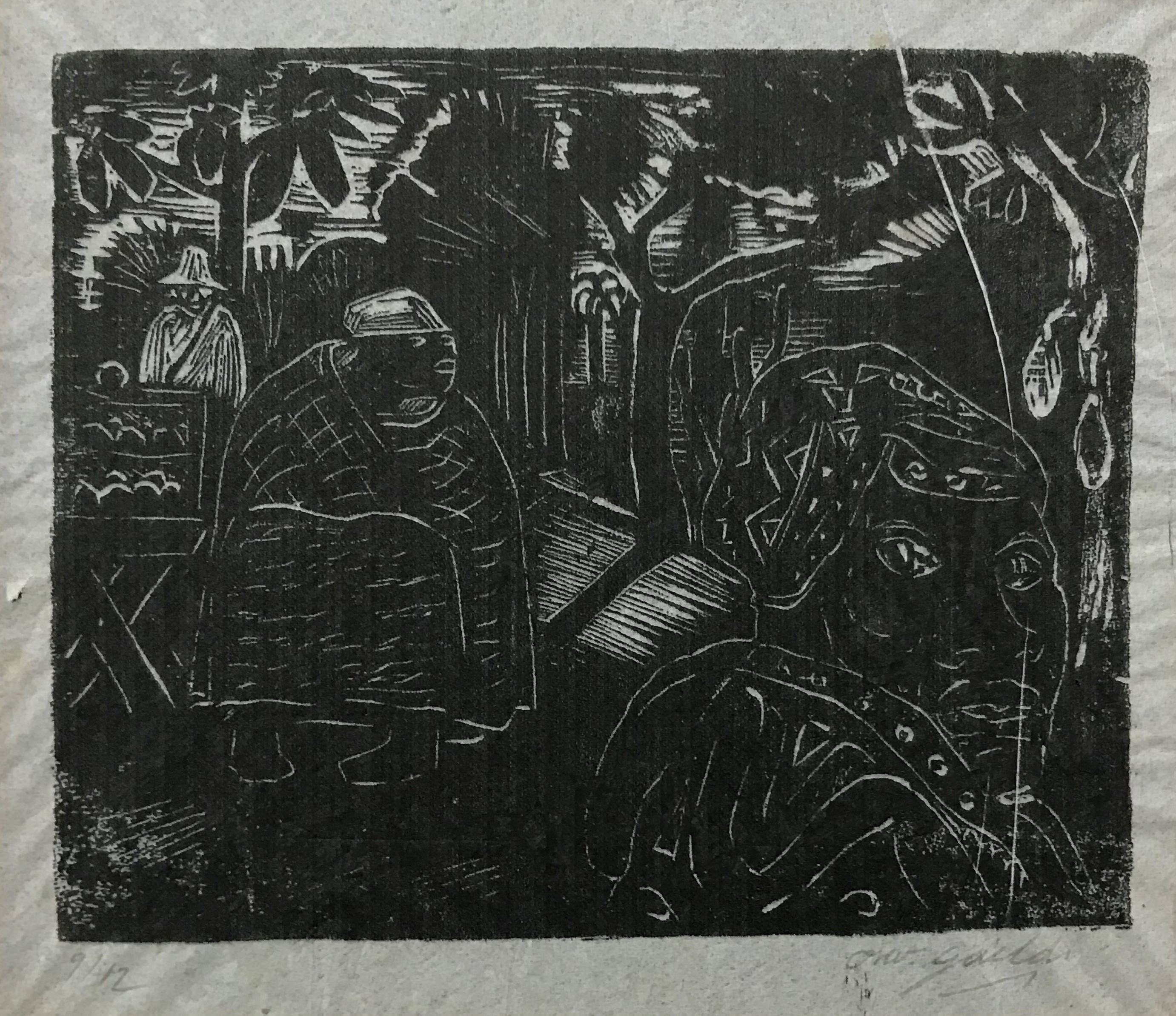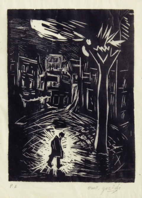 OSWALDO GOELDI "S/ Titulo" Xilogravura S/ Papel de Arroz -Exemplar 1/3 -Med 20x15 cm (MI) 39x30 cm (Mold) -Da Primeira Tiragem Póstuma de Oswaldo Goeldi de 1971 por Beatriz Reynal -Titulada, Numerada, Catalogada e Assinada no Centro por Beatriz Reynal -Com moldura em alumínio de época, paspartur e vidro de proteção.