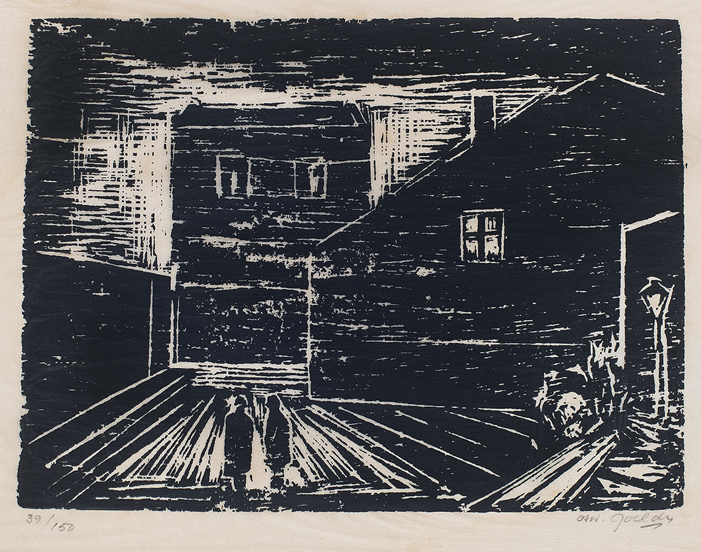 OSWALDO GOELDI "S/ Titulo" Xilogravura S/ Papel de Arroz -Exemplar 1/3 -Med 15x20 cm (MI) 39x30 cm (Mold) -Da Primeira Tiragem Póstuma de Oswaldo Goeldi de 1971 por Beatriz Reynal -Titulada, Numerada, Catalogada e Assinada no Centro por Beatriz Reynal -Com moldura em alumínio de época, paspartur e vidro de proteção.