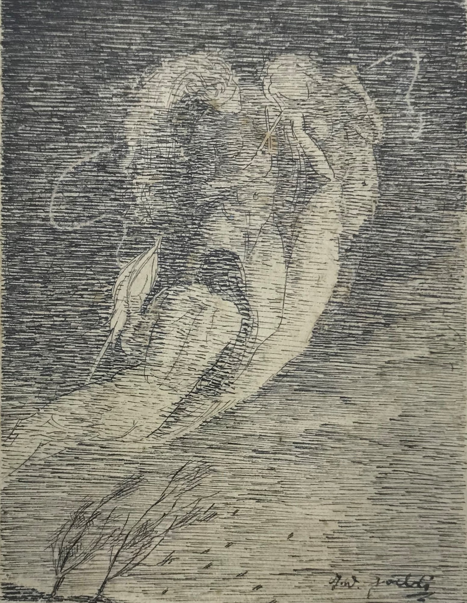 OSWALDO GOELDI "S/ Titulo" Xilogravura S/ Papel de Arroz -Exemplar 1/3 -Med 20x15 cm (MI) 39x30 cm (Mold) -Da Primeira Tiragem Póstuma de Oswaldo Goeldi de 1971 por Beatriz Reynal -Titulada, Numerada, Catalogada e Assinada no Centro por Beatriz Reynal -Com moldura em alumínio de época, paspartur e vidro de proteção.