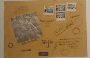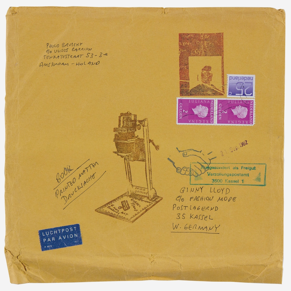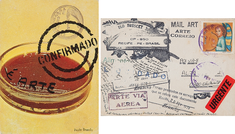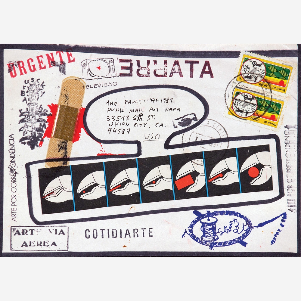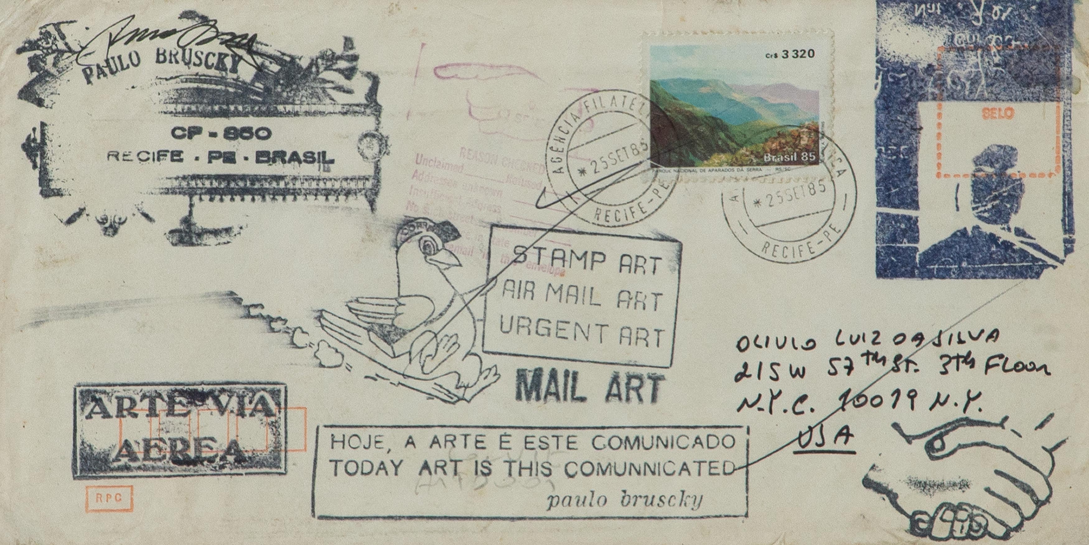 Paulo Bruscky - Hoje, a arte é esse comunicado - 1985 - Carimbos e selo sobre envelope - Assinado canto superior esquerdo - 11 x 22 cm.