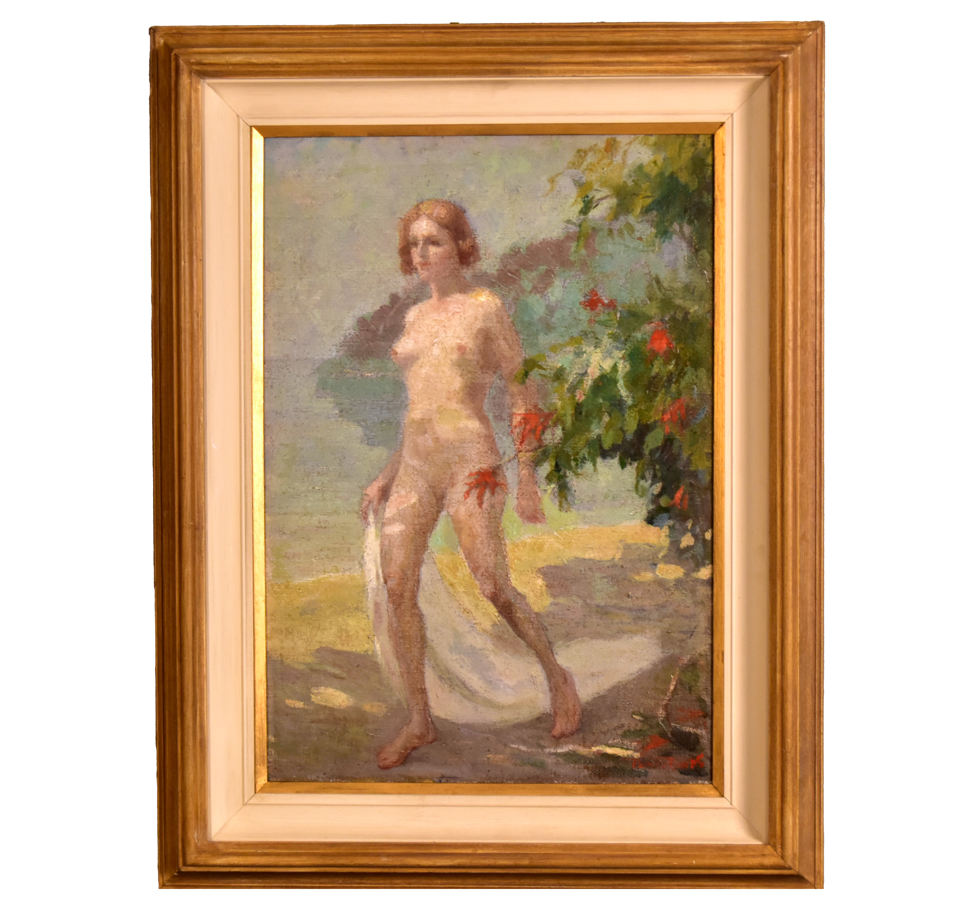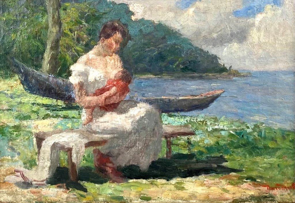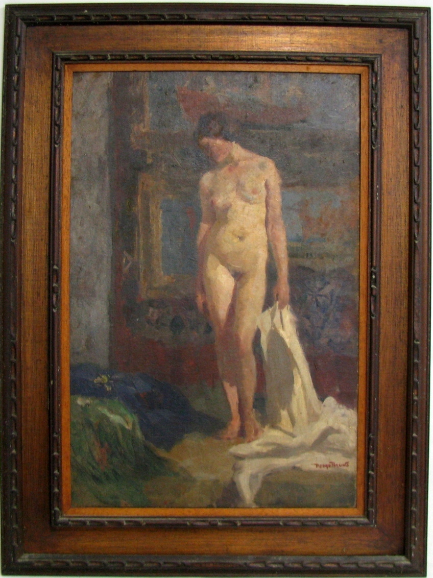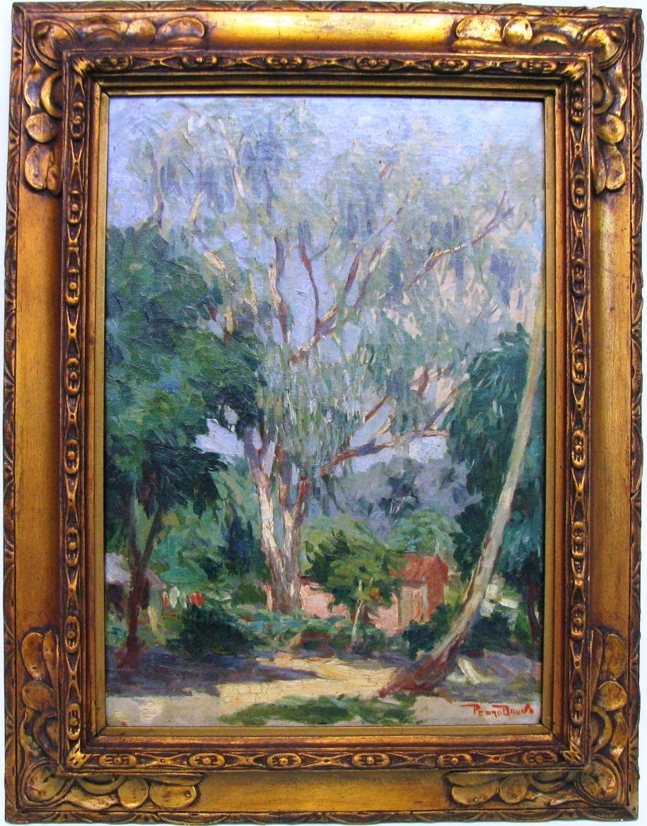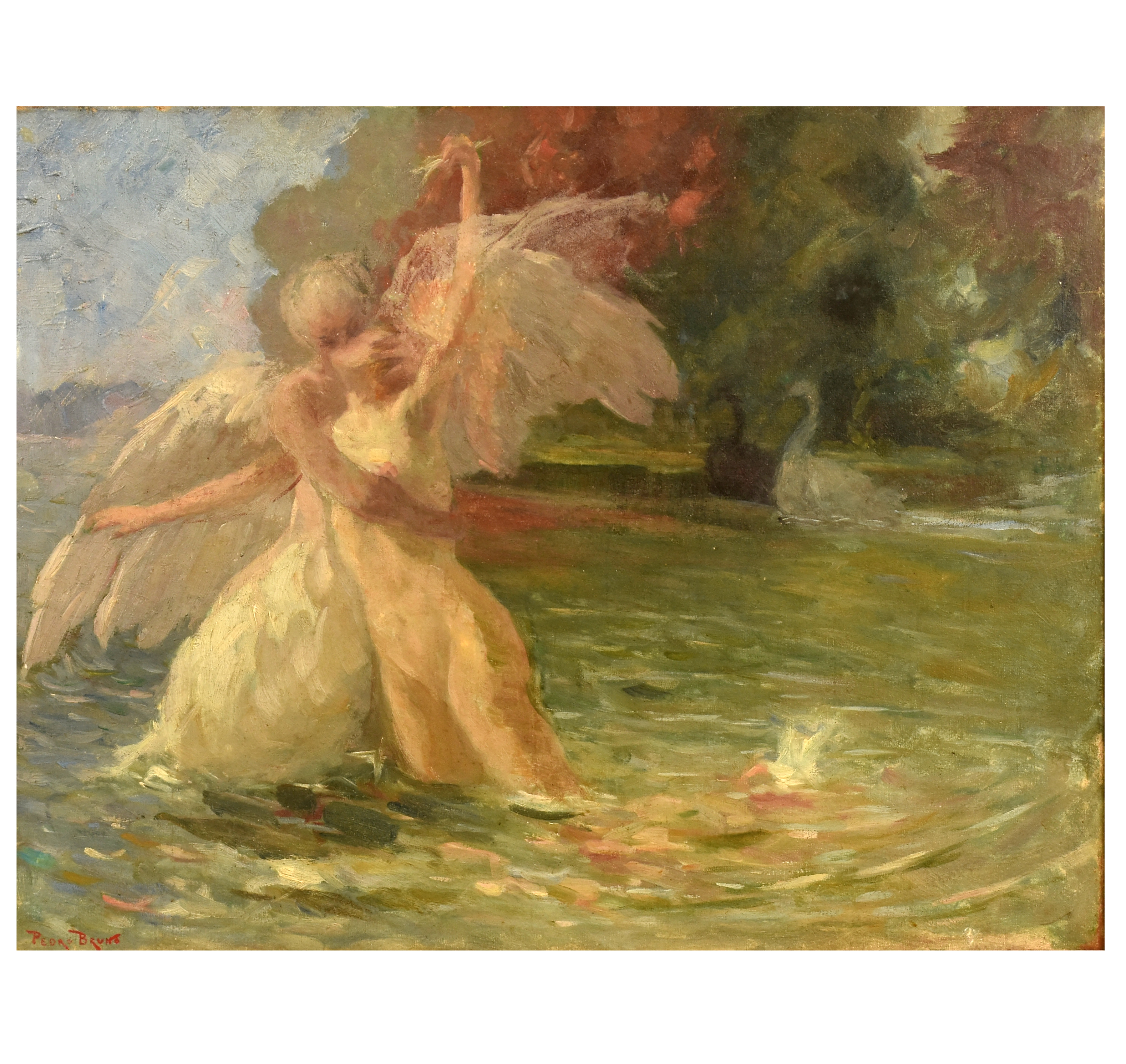 PEDRO BRUNO (1888 1949) "Leda e o cisne" Óleo sobre tela Med: 50 x 65 cm.Pedro Bruno, um prodígio da arte desde a tenra idade, iniciou sua jornada artística aos seis anos com Giovanni Battista Castagneto. Sua carreira meteórica levou a estudar música e arte em conservatórios renomados na Europa e no Brasil. Com talento excepcional, conquistou prêmios e reconhecimento em exposição de Belas Artes, destacando-se pela precocidade e maestria em suas obras. Seu legado artístico inclui obras icônicas como "Gonçalves Dias" e "Pátria", esta última imortalizada na nota de 200 cruzados novos. Pedro Bruno deixou sua marca não apenas no Brasil, mas também na Itália, com obras em museus renomados. Sua influência perdura, sendo homenageado com um busto em Paquetá e uma rua em São Paulo em sua memória.