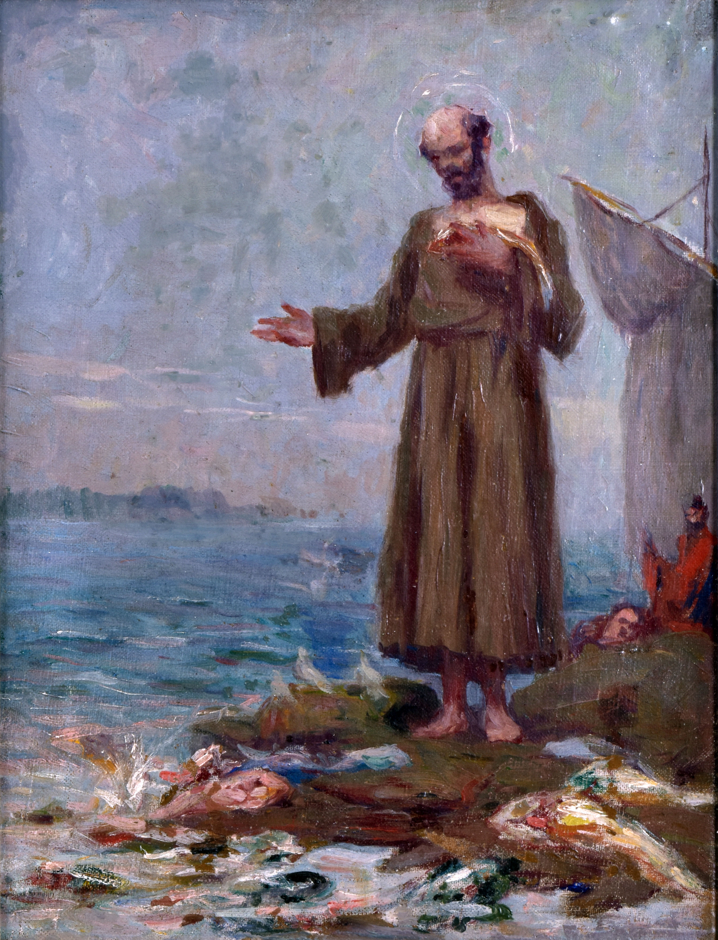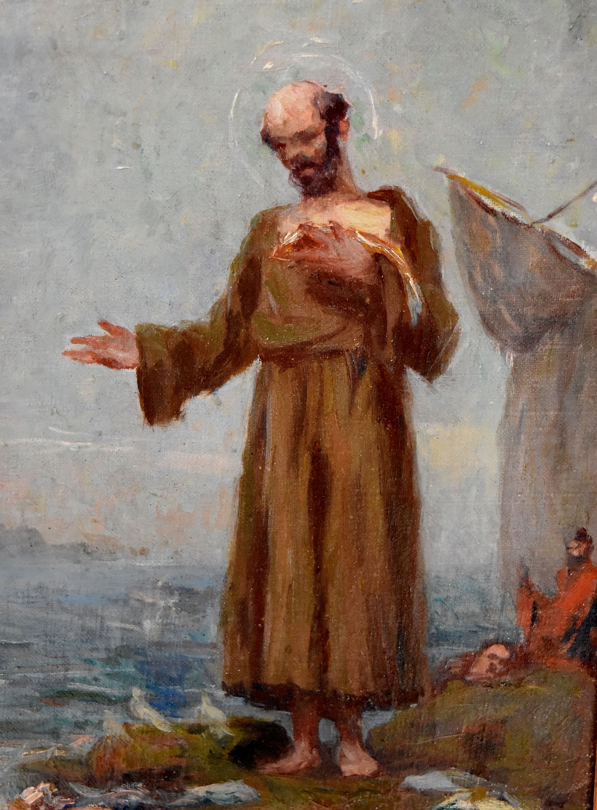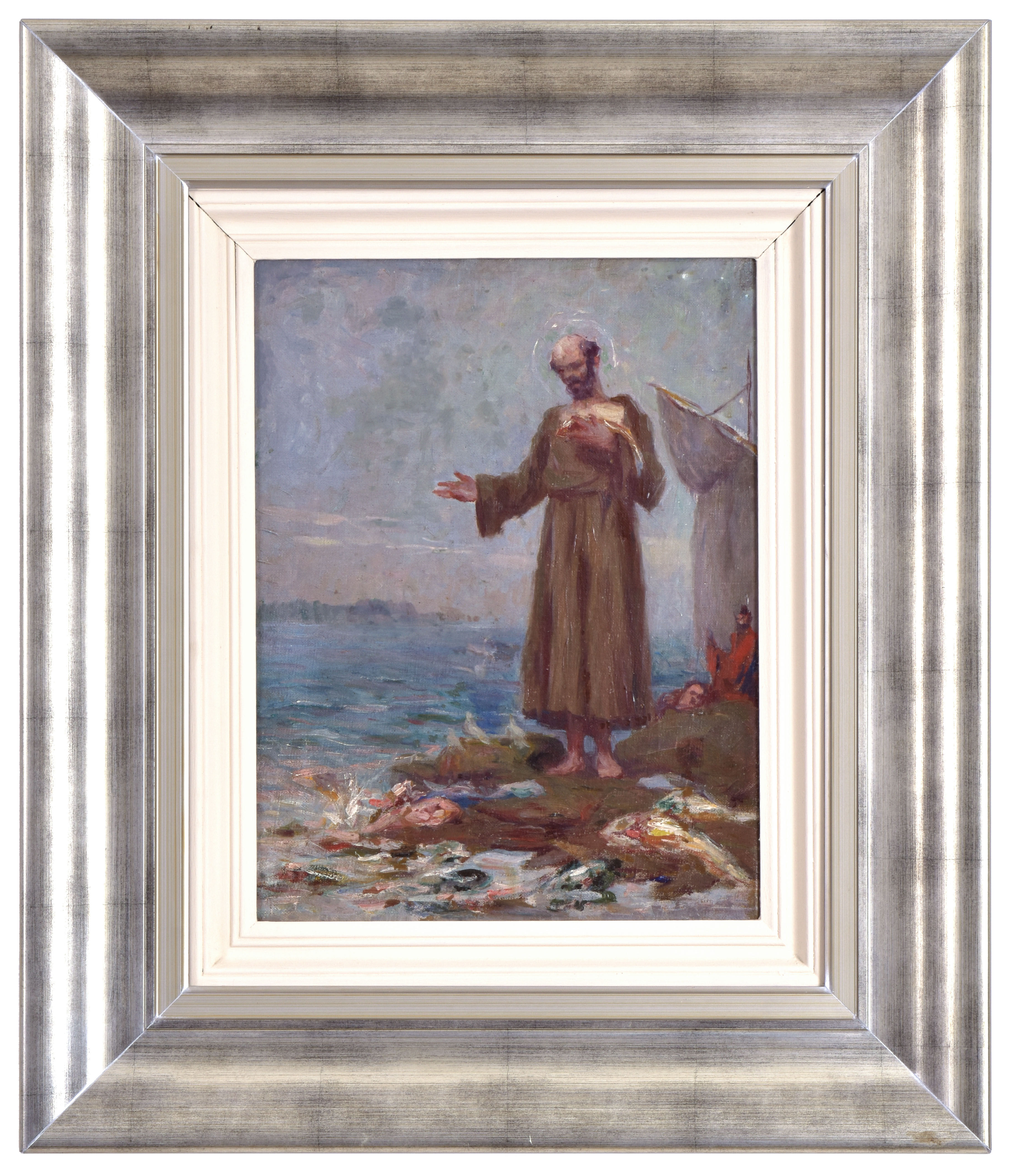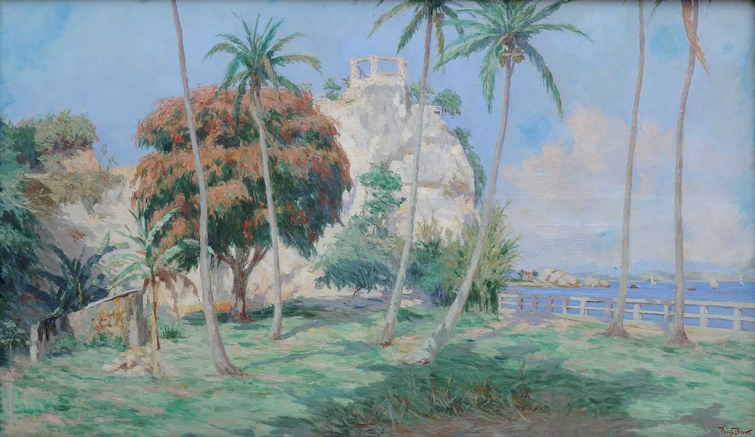 PEDRO BRUNO (Paquetá, 14 de outubro de 1888 Rio de Janeiro, 2 de fevereiro de 1949) - "Figura feminina". Óleo sobre tela, 50 x 38,5 cm. Assinado no C.I.E. Moldura de madeira e gesso dourado, 70,5 x 58 cm.Pedro Bruno, um prodígio da arte desde a tenra idade, iniciou sua jornada artística aos seis anos com Giovanni Battista Castagneto. Sua carreira meteórica levou a estudar música e arte em conservatórios renomados na Europa e no Brasil. Com talento excepcional, conquistou prêmios e reconhecimento em exposição de Belas Artes, destacando-se pela precocidade e maestria em suas obras. Seu legado artístico inclui obras icônicas como "Gonçalves Dias" e "Pátria", esta última imortalizada na nota de 200 cruzados novos. Pedro Bruno deixou sua marca não apenas no Brasil, mas também na Itália, com obras em museus renomados. Sua influência perdura, sendo homenageado com um busto em Paquetá e uma rua em São Paulo em sua memória. DA TEMÁTICA: Antonio Vieira (Lisboa, Sé, 6 de fevereiro de 1608 — Salvador, 18 de julho de 1697). Padre Antonio Vieira é o maior representante da prosa barroca no Brasil e o maior orador sacro do Brasil-Colônia. Nascido em Portugal, veio para o Brasil ainda criança e estudou no Colégio dos Jesuítas, em Salvador. O sermão foi proferido em São Luís do Maranhão em 13 de junho de 1654, dia de Santo Antônio e três dias antes da partida de Vieira para Portugal, onde pretendia interceder em favor dos índios diante das autoridades portuguesas. O sermão é construído em forma de alegoria, dirige-se aos peixes mas, na verdade, fala aos homens. Exalta as qualidades dos peixes, como a obediência, e repreende os vícios, como a soberba e o oportunismo. Deve-se destacar aí a citação de diversos tipos de peixes. As virtudes são descritas nos peixes de Tobias, Rémora, Torpedo e Quatro-Olhos. Já os defeitos estão nos seguintes peixes: Roncadores, Pegadores, Voadores e no Polvo. O principal defeito apontado é a voracidade, já que os peixes devoram uns aos outros, e, pior ainda, os maiores devoram os menores.