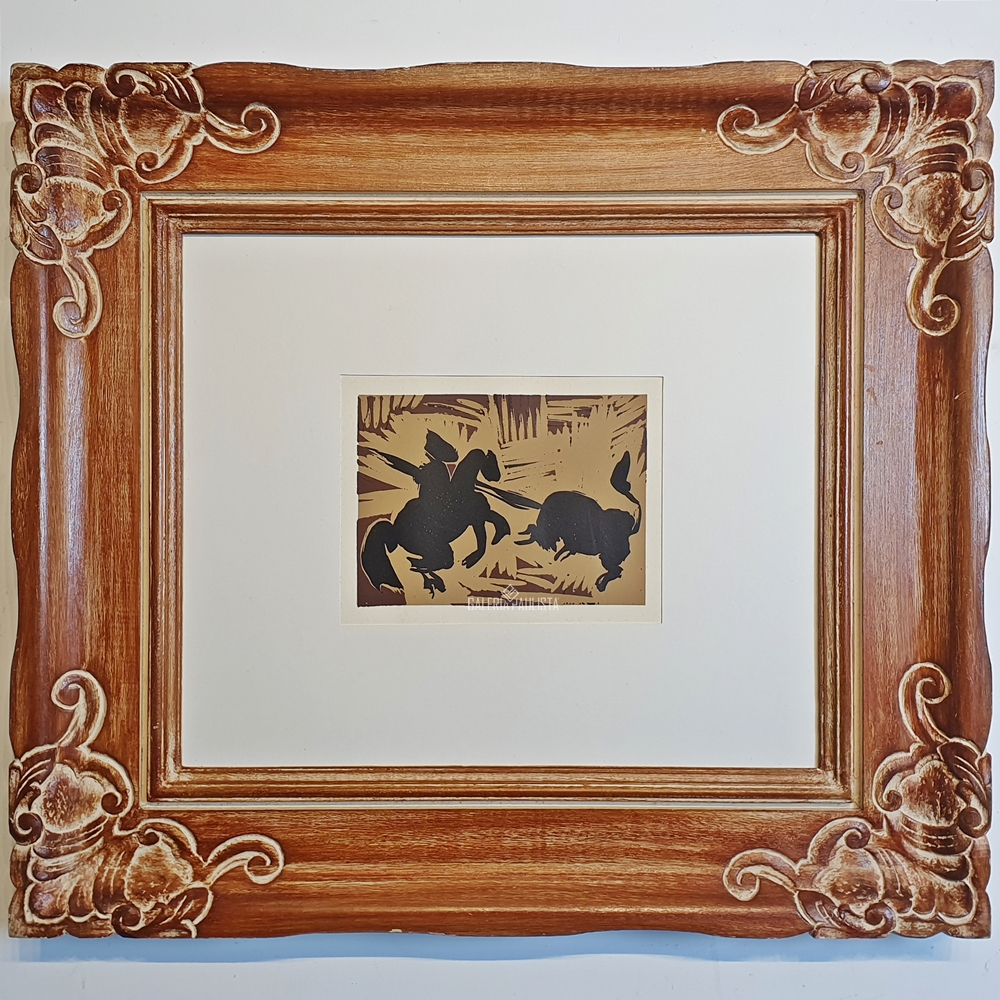 PABLO PICASSO "Pique" LinóleoGravura Colorido -Med 16,5 x 22,5 cm -Data 1959 -Possui exemplar idêntico reproduzido fotograficamente na pág. 21 do Livro "Picasso-1986, escrito por Roger Passeron - Catalogação 940". Medida Total 67x75 cm com a moldura em madeira e vidro de proteção. Sem assinatura. Estado de conservação: ótimo. (Obra estrangeira: toda obra estrangeira será vendida como atribuição).