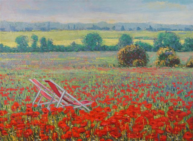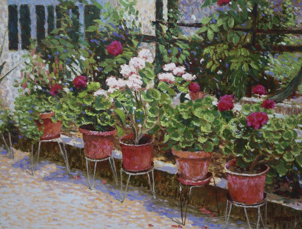 Todos os dias, quando chego ao meu ateliê, realizo um pequeno ritual: rego as plantas (elas fazem parte do meu dia-a-dia), limpo os pincéis, passeio pelo jardim, olho o céu, folheio livros e revistas procurando situações que toquem o coração. Pode ser um buquê de flores na janela, uma cadeira no jardim numa tarde ensolarada, uma foto de viagem. Enfim, algo que funcione como uma passagem para um mundo de sensibilidade. Muitas vezes, sem perceber, começo a mexer nos pincéis e tocar a tela.