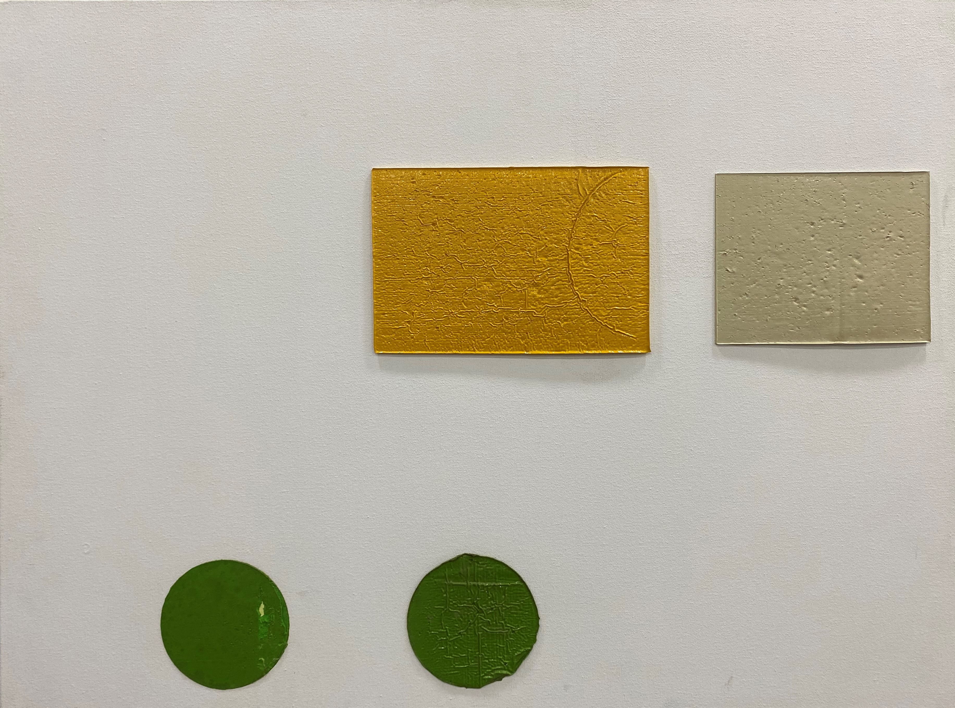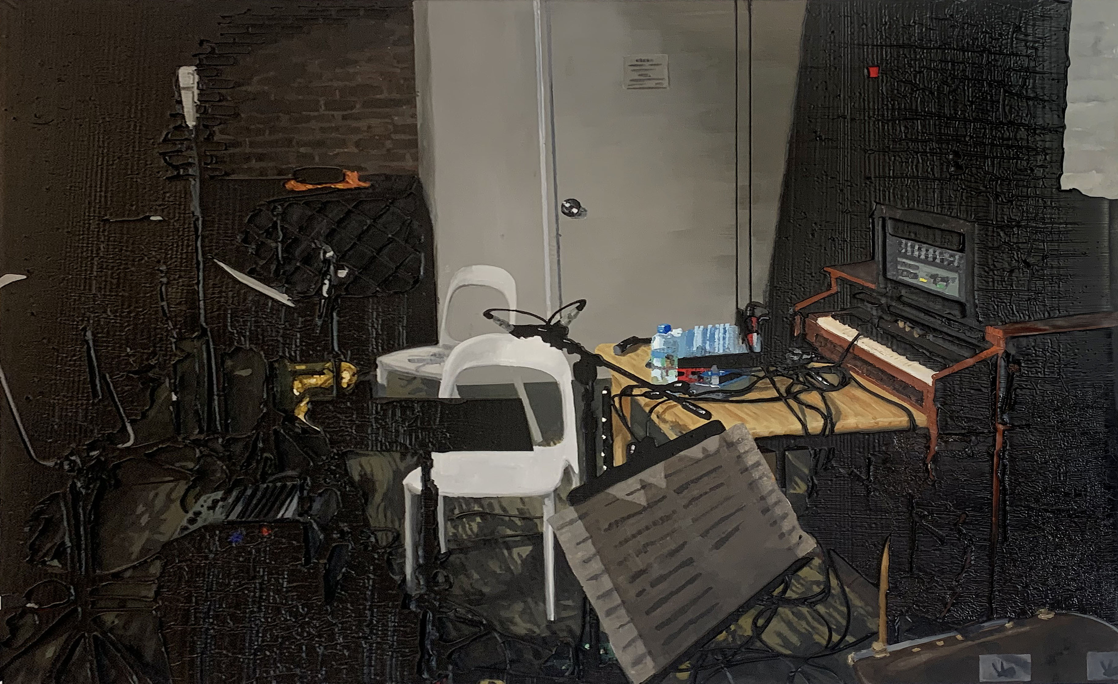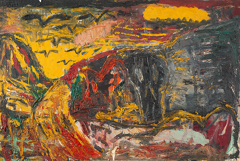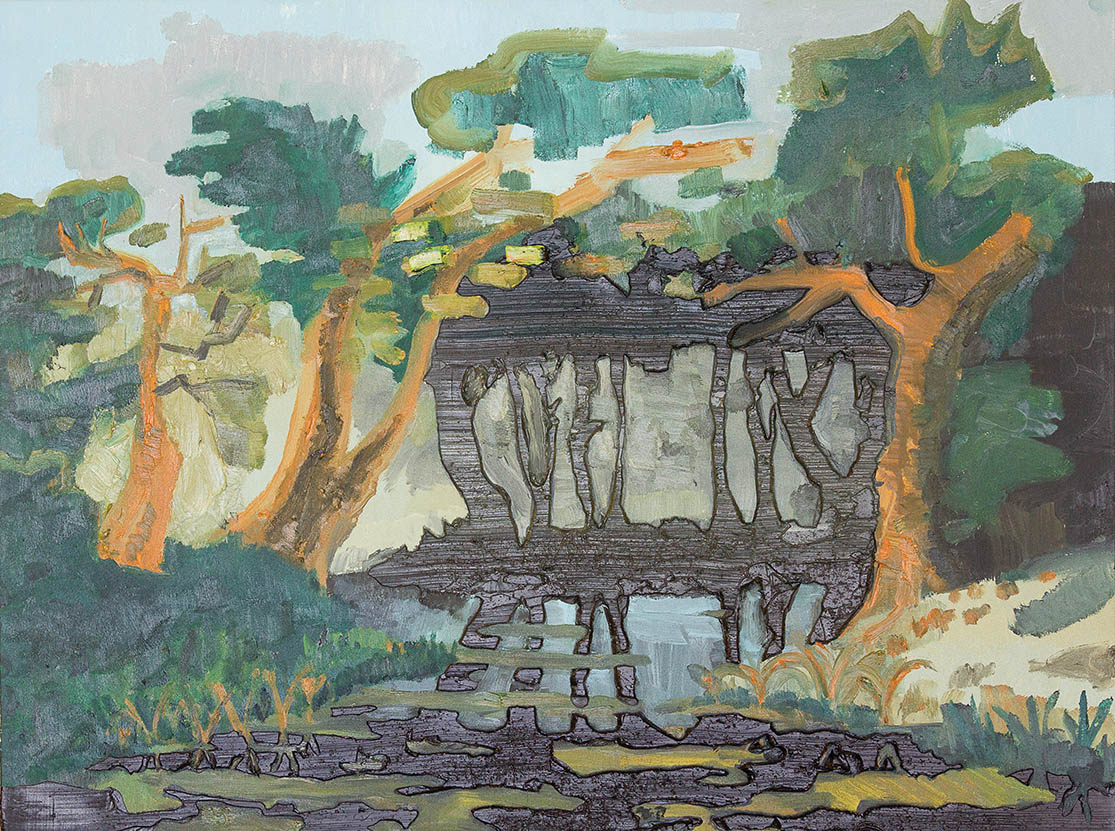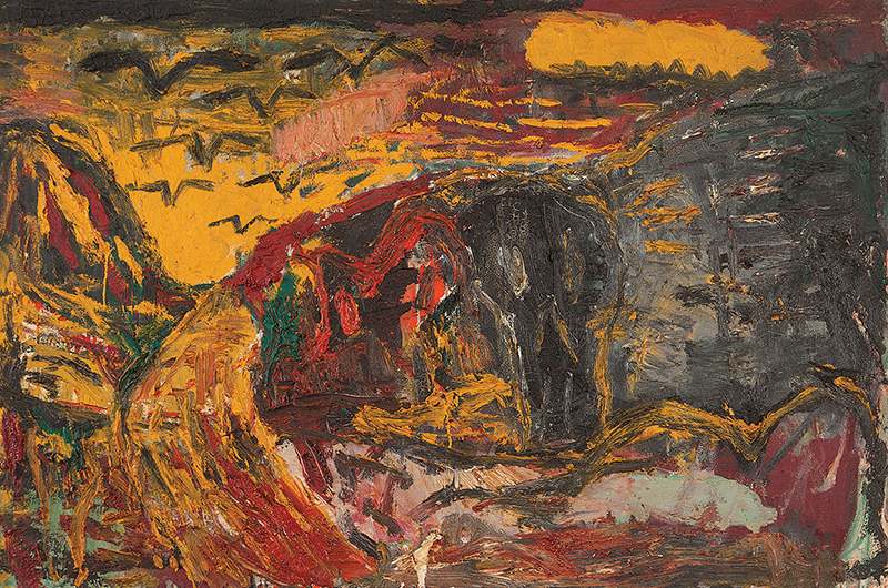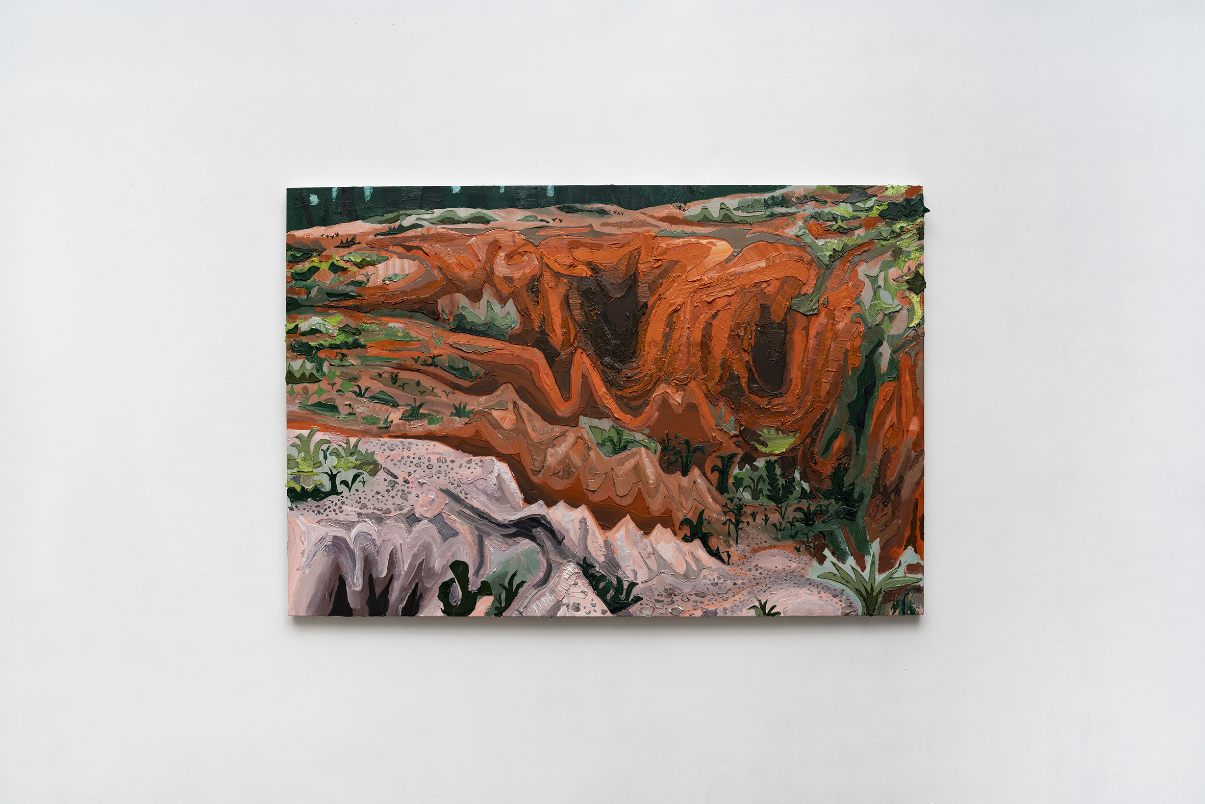 A materialidade da tinta e referências sobre a história da pintura permeiam o trabalho de Rodrigo Andrade. Sua gestualidade vibrante manifesta-se sobretudo na pintura, mas também transita por suportes como desenho, gravura e objeto. Nos anos 1980, o artista integrou o grupo Casa 7 e, sob a influência do neoexpressionismo alemão, sua obra é apresentada em grandes formatos, com pinceladas expressivas e cores fortes. Na década seguinte, alternou trabalhos figurativos e abstratos e, a partir de 1999, passou a criar obras em que espessas massas de tinta a óleo, em formas geométricas, são aplicadas sobre a tela. Ele instalou suas pinturas matéricas de cor e forma em espaços públicos de São Paulo, e em seu contato com esses entornos é que reside sua potência: há uma permeabilidade entre a concentração e a contenção dos elementos presentes nos trabalhos do artista e nos ambientes nos quais foram instalados.