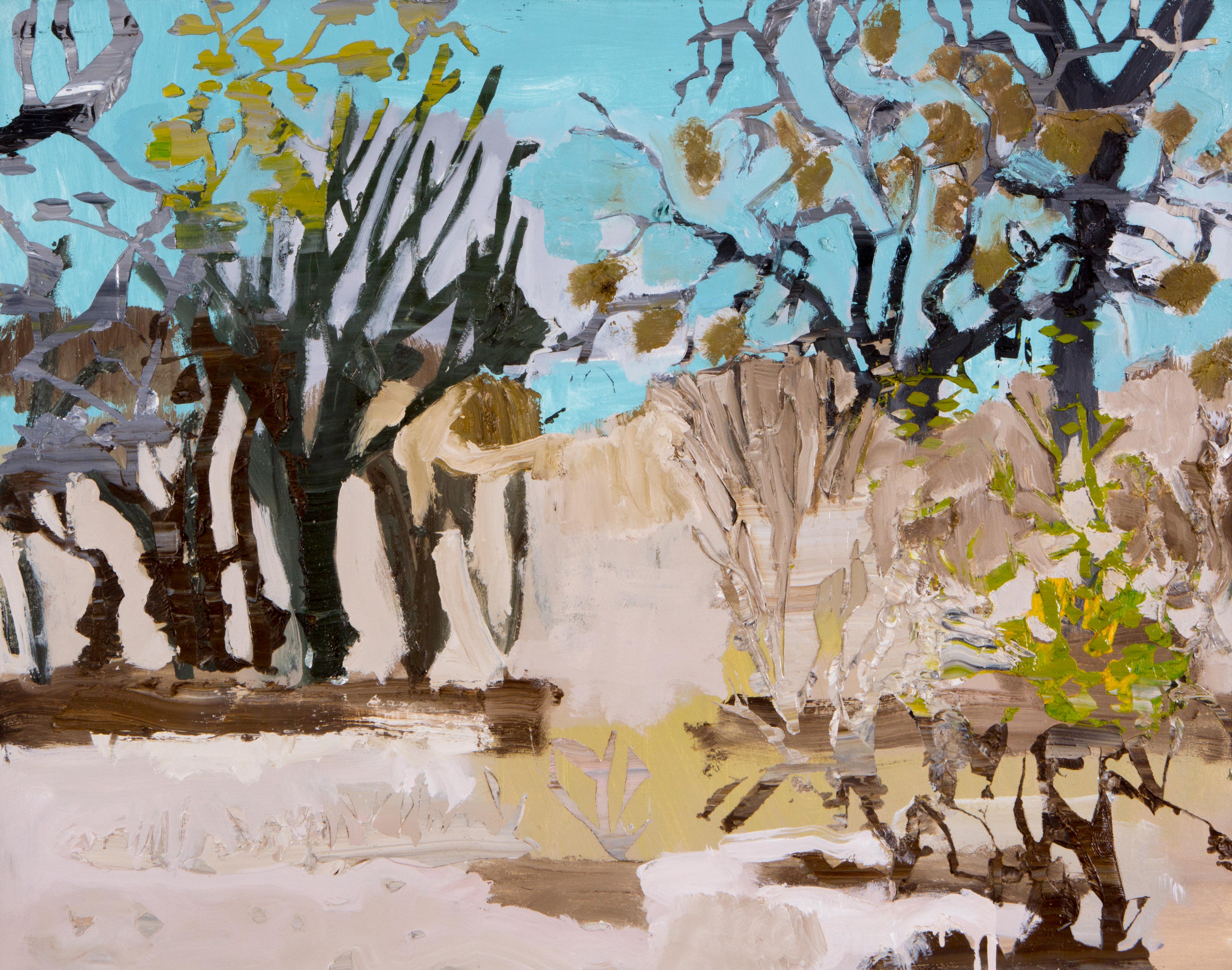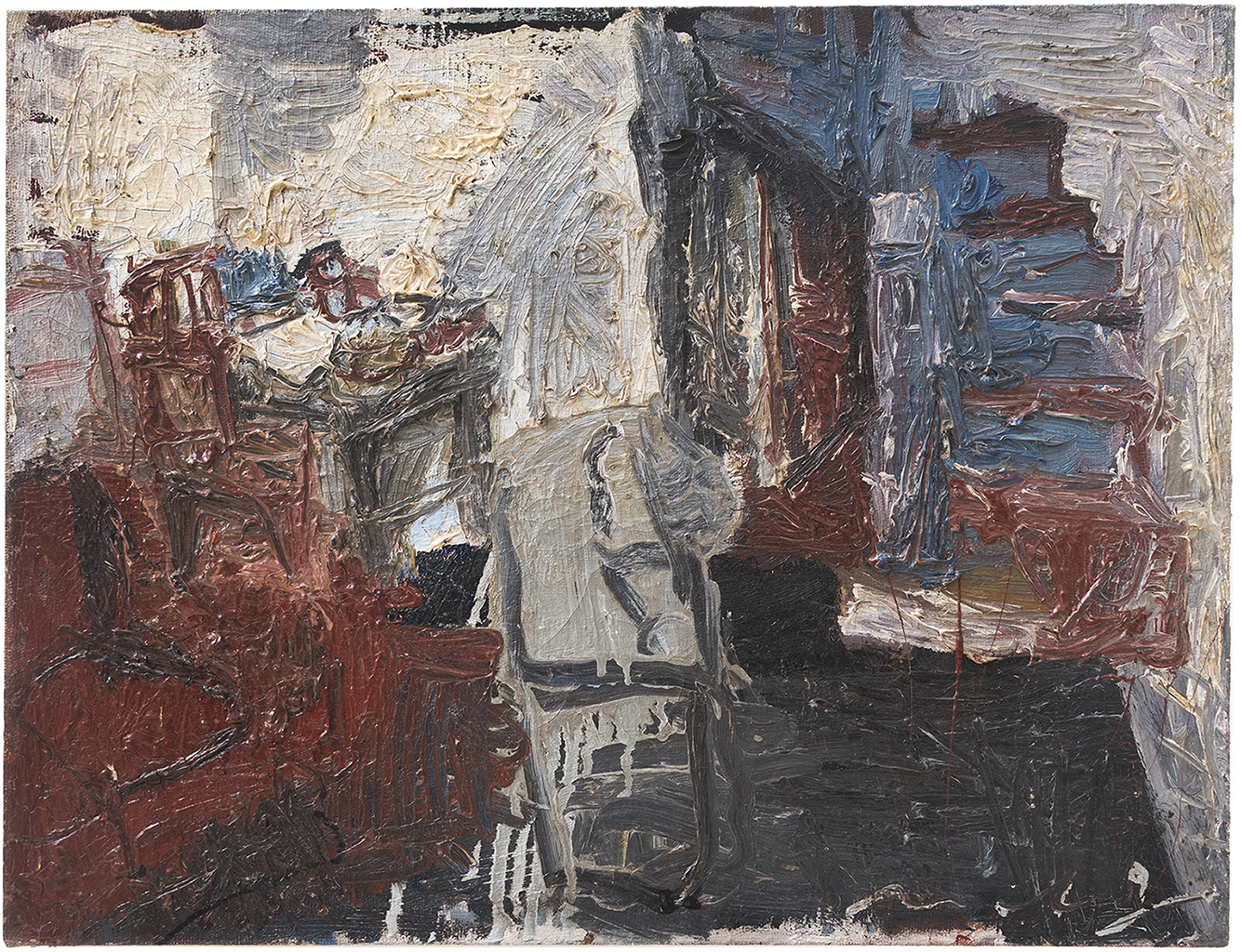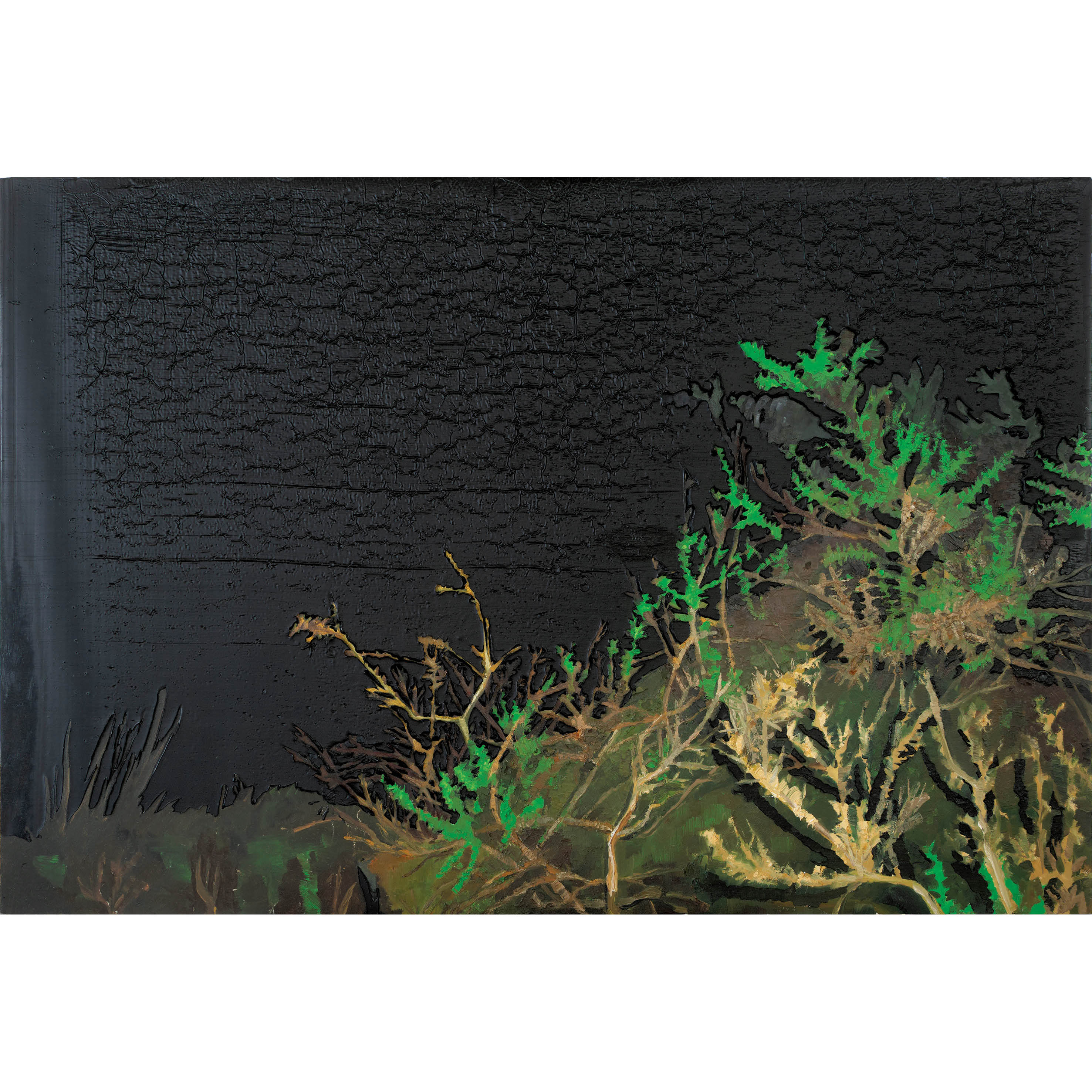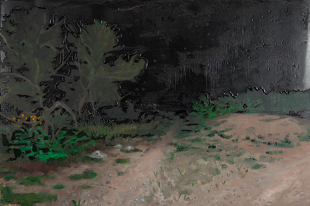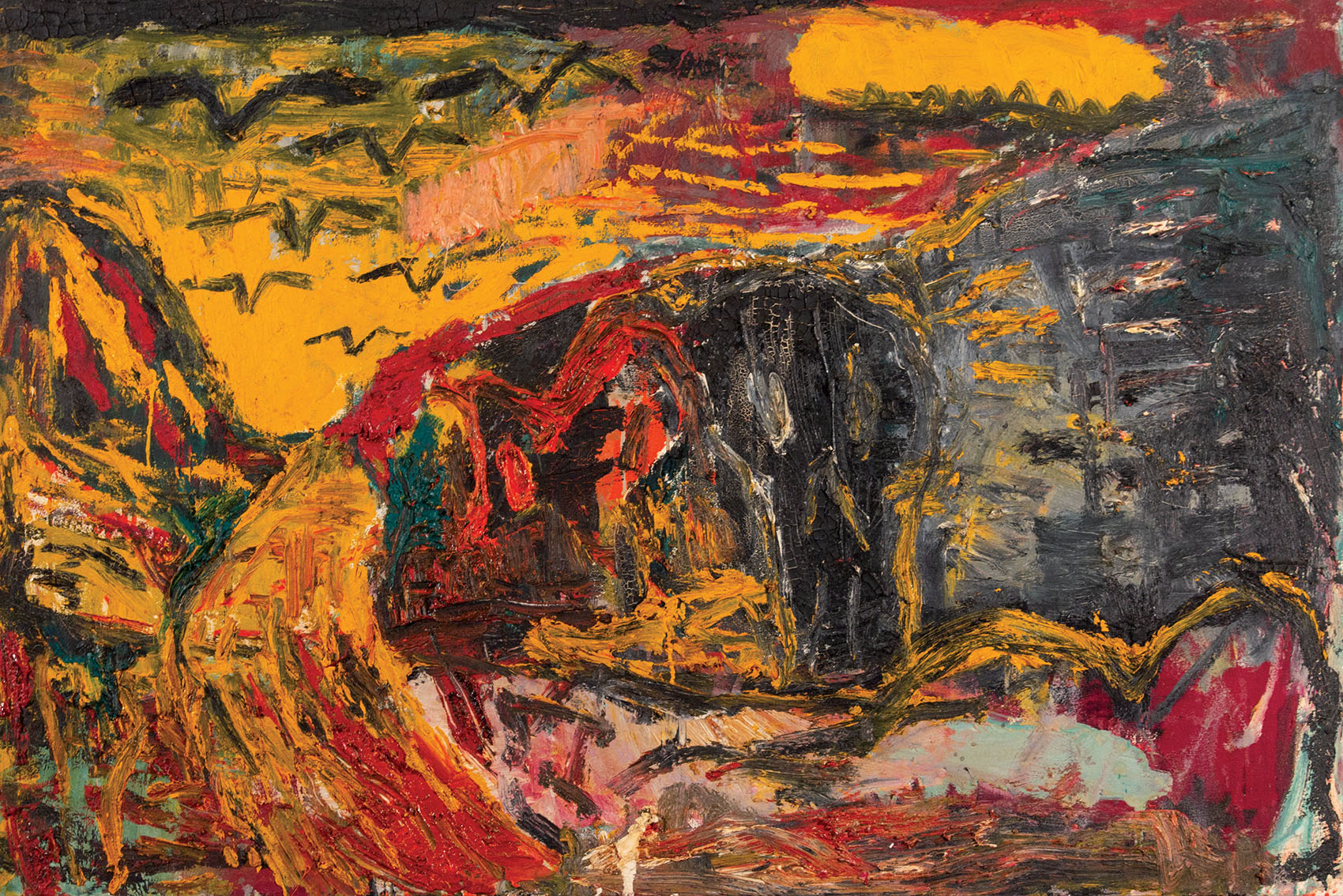 A materialidade da tinta e referências sobre a história da pintura permeiam o trabalho de Rodrigo Andrade. Sua gestualidade vibrante manifesta-se sobretudo na pintura, mas também transita por suportes como desenho, gravura e objeto. Nos anos 1980, o artista integrou o grupo Casa 7 e, sob a influência do neoexpressionismo alemão, sua obra é apresentada em grandes formatos, com pinceladas expressivas e cores fortes. Na década seguinte, alternou trabalhos figurativos e abstratos e, a partir de 1999, passou a criar obras em que espessas massas de tinta a óleo, em formas geométricas, são aplicadas sobre a tela. Ele instalou suas pinturas matéricas de cor e forma em espaços públicos de São Paulo, e em seu contato com esses entornos é que reside sua potência: há uma permeabilidade entre a concentração e a contenção dos elementos presentes nos trabalhos do artista e nos ambientes nos quais foram instalados.