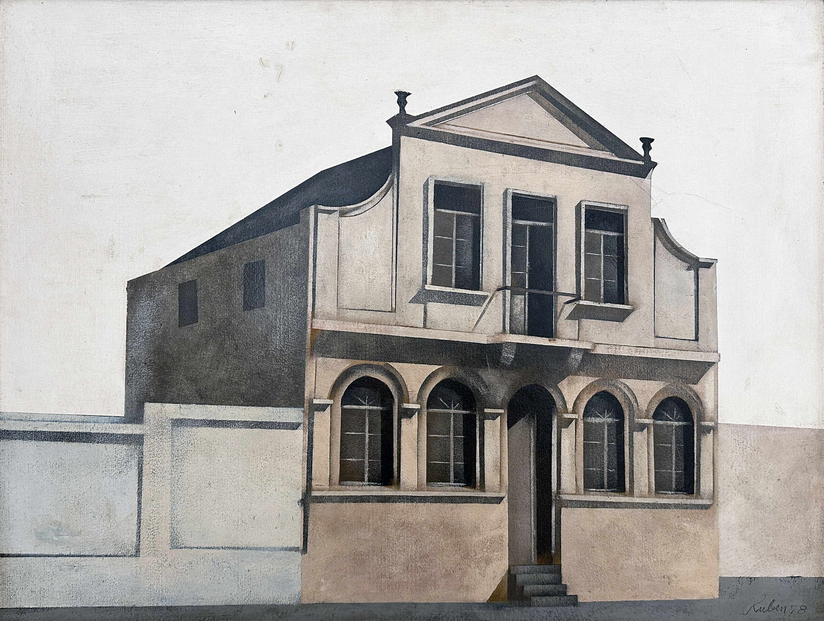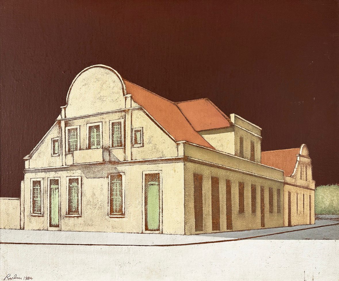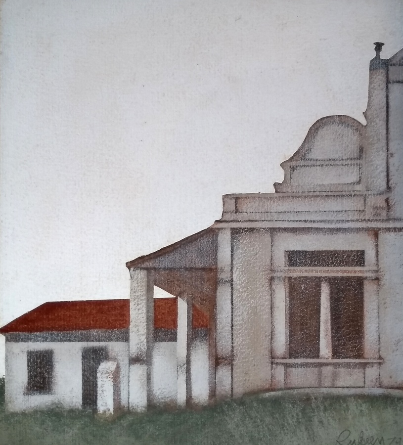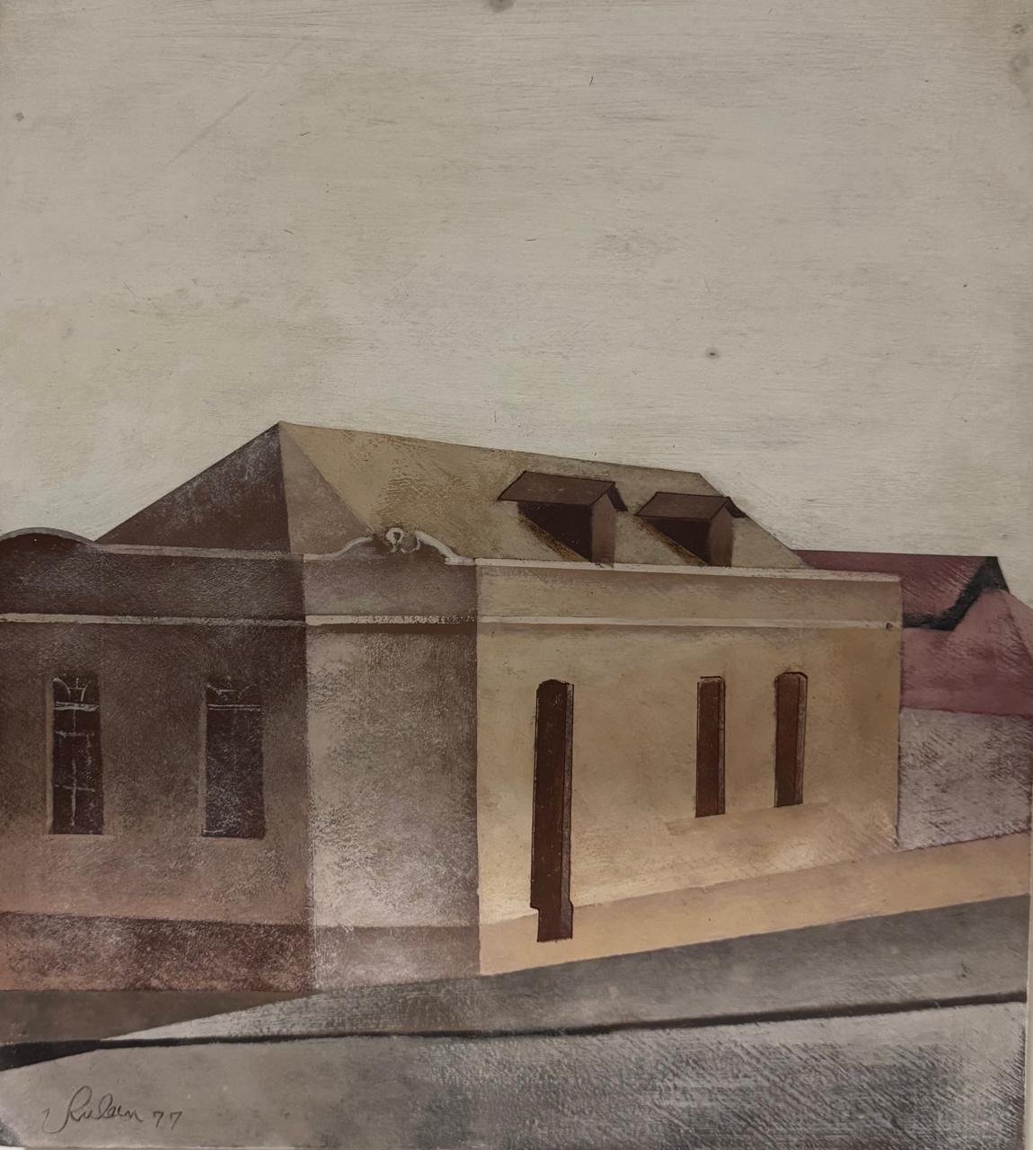 Ruben Esmanhotto - Cenário, 1978 - Vinil encerado sobre placa, assinado e datado inferior direito. (precisa de restauro) - 60 x 80 cm.
