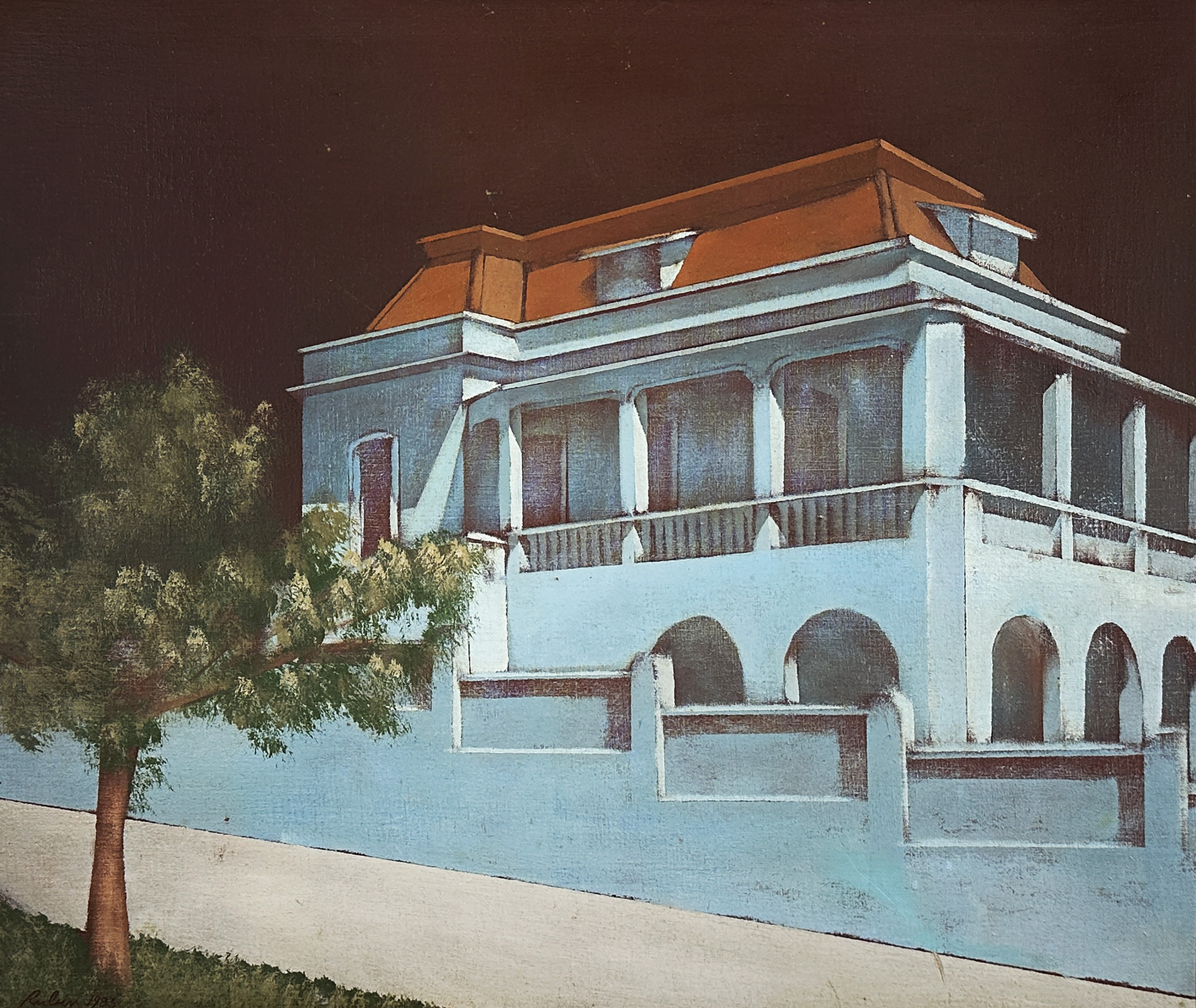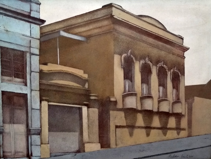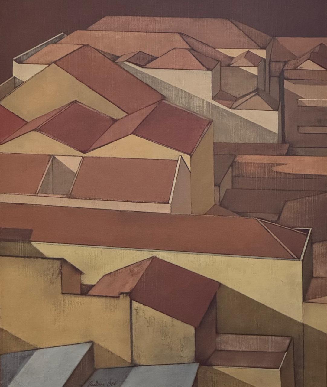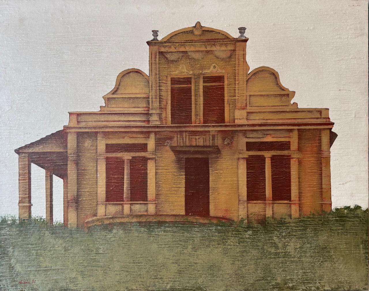 Ruben Esmanhotto - Cenário, 1978 - Vinil encerado sobre placa, assinado e datado inferior direito. (precisa de restauro) - 60 x 80 cm.