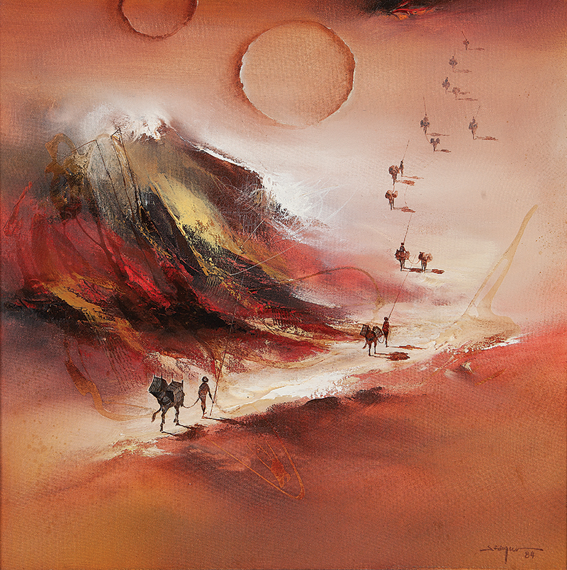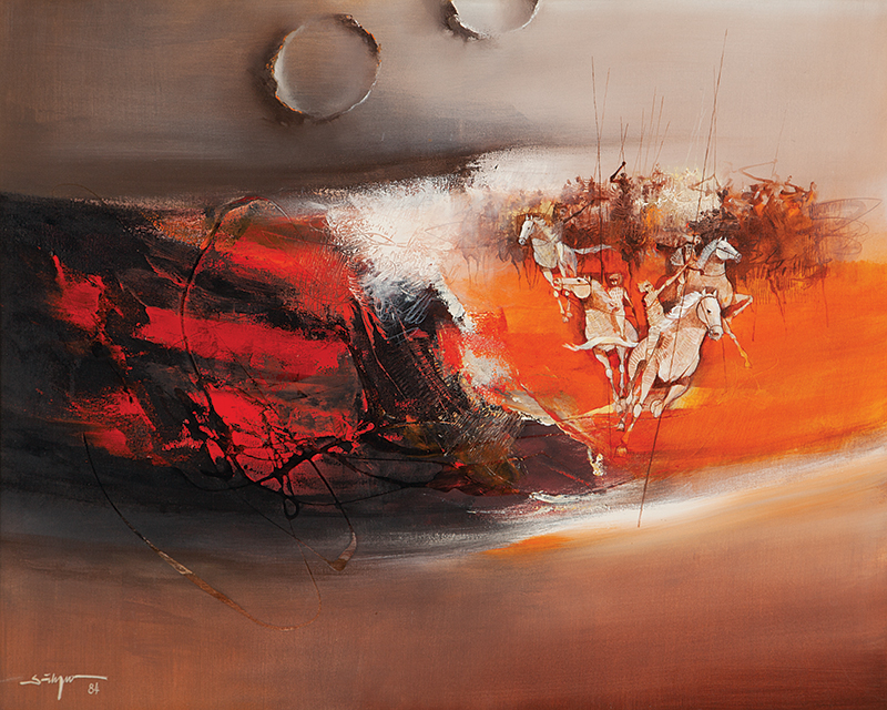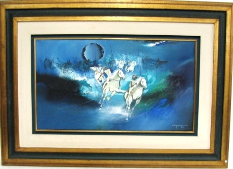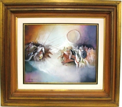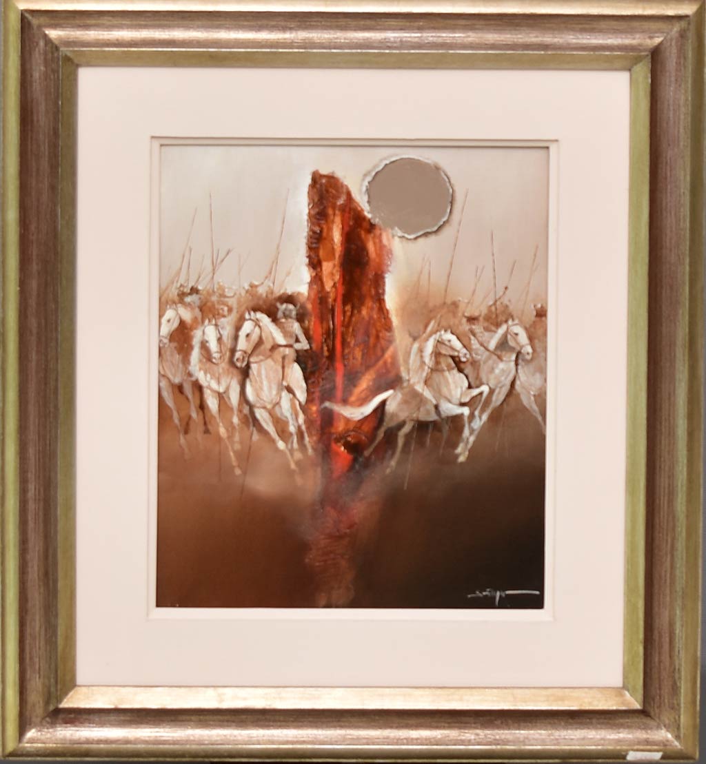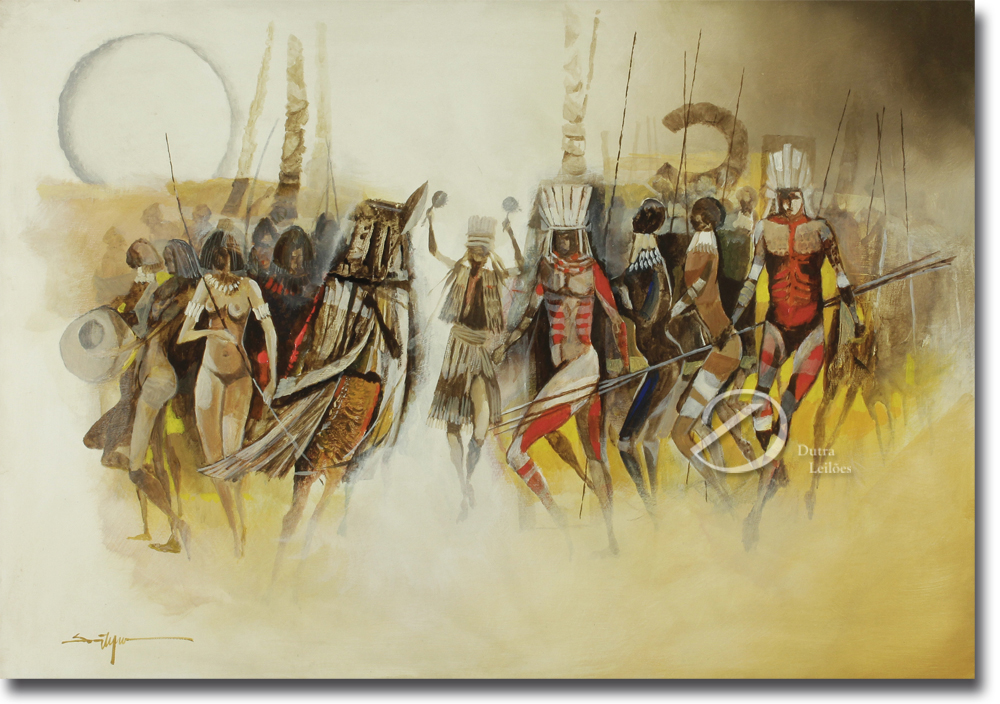 SATYRO MARQUES ( Maceió, AL 1935 - 2019) "Totém Apolítica" II Datado de 1986 Medidas: 38 x 46 cm. Com moldura: 66 x 74 cm. BIOGRAFIA: Iniciou carreira Rio de Janeiro, entorno de 1952. Já em 1976 recebe a medalha de bronze do Salão Nacional de Belas Artes no Rio de Janeiro. Em 1981 em Paris, na França expõe na sede do Banco do Brasil Em 1983 em Montreal, no Canadá, participa do "Premier Salon National des Galeries D'Art" no Palacio do Congresso. Em 1983 em Quebec, no Canadá, participa do "Premier Salon National des Galeries D'Art" no também no Palácio do Congresso. Em 1984 expõe em Lafayette nos Estados Unidos, na Live Dadalley Gallery Em 1985 junto com Aldemir Martins, Rapaport, Scliar, Virgolino, expõe em São Paulo SP. No ano de 1989 tem individual em São Paulo, SP. Com o título: "Trinta e Três Maneiras de Ver o Mundo." Novamente em 1991 Expõe em São Paulo com o tema: "A Música na Pintura"" Em 1993 participa em Coral Gables, Estados Unidos, da Coletiva Internacional, no The Embassy of Internacional Art Novamente em 1995 participa em Coral Gables, Estados Unidos da Coletiva Internacional, na Overseas Gallery. Posteriormente com frequência expõe na Nova André Galeria de São Paulo. Ao longo de sua carreira obteve os títulos distintivos: Gran Cruz da Ordem do Mérito das Belas Artes, Medalha Honoris Arts/SBBA, Comenda da Ordem do Mérito Presidente Antonio Carlos, Ordem do Mérito Santos Dumont.