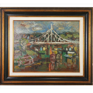 TADASHI KAMINAGAI, Paisagem com Ponte, OSE, ACID, 49 x 63cm. (m.i). Datado 1953