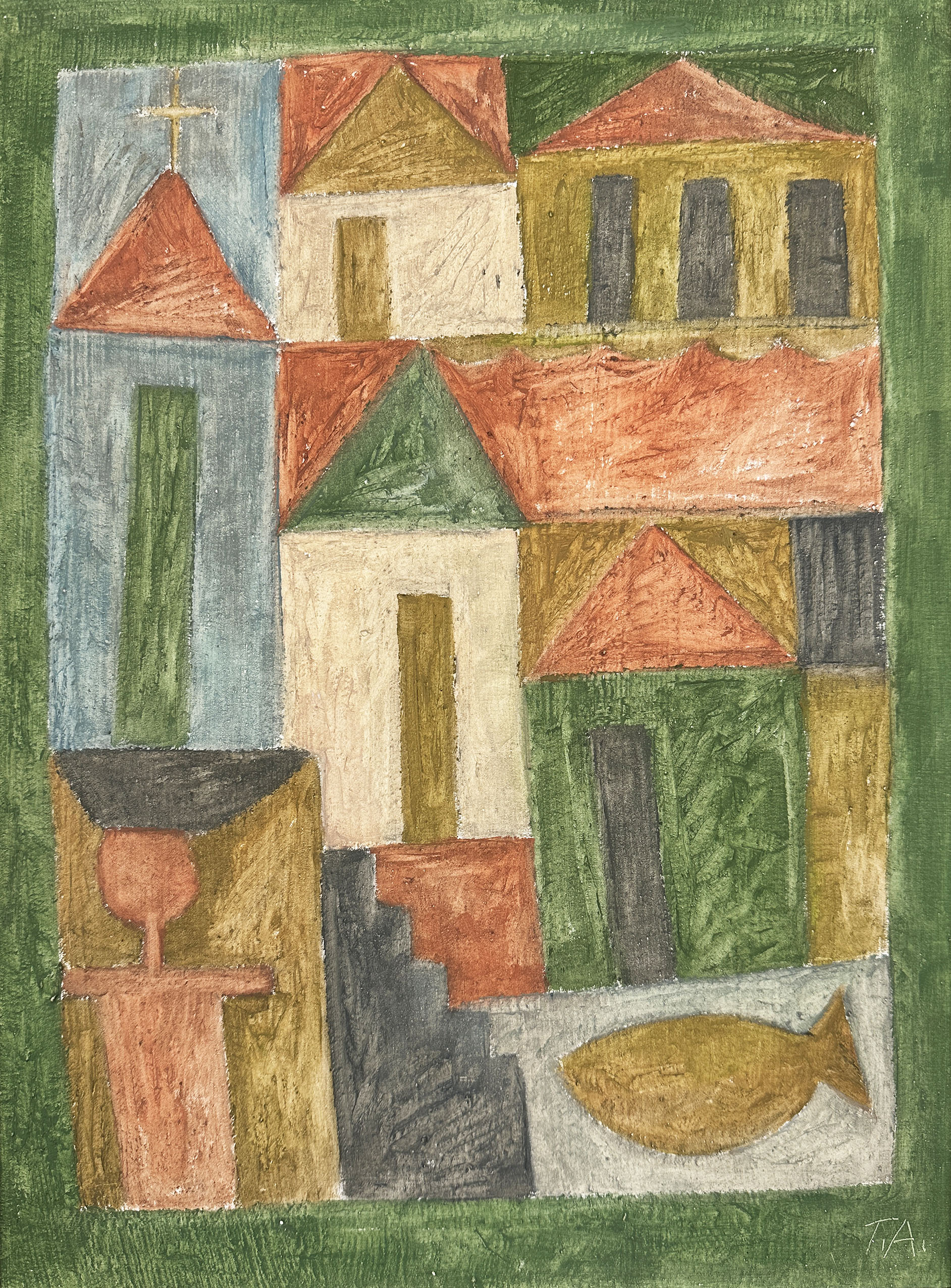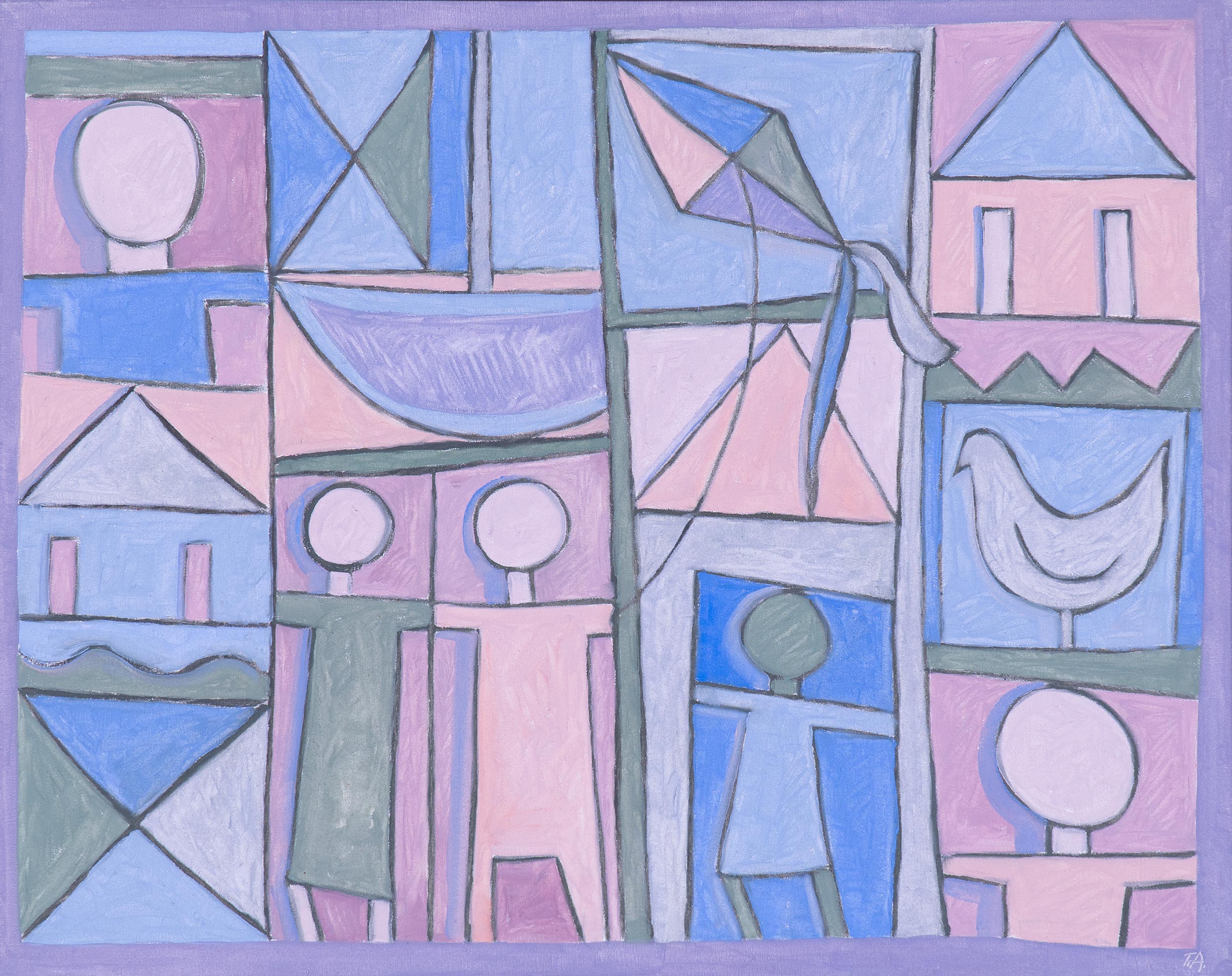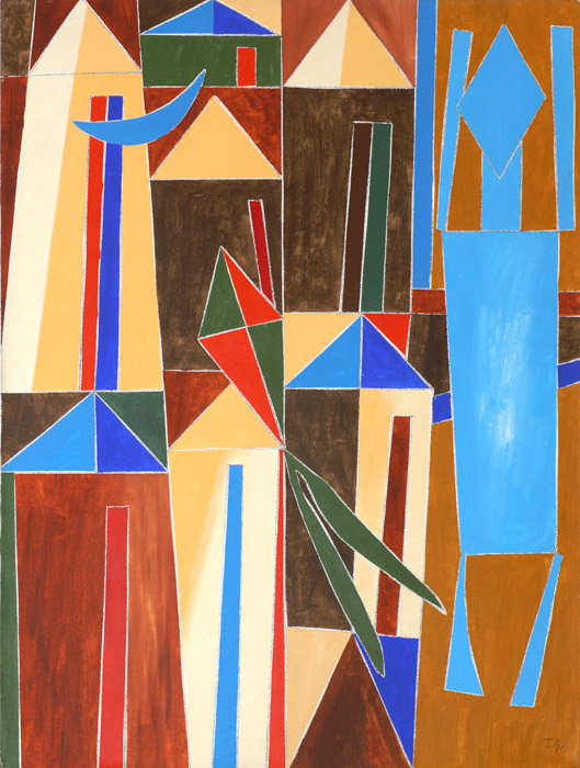 Tito de Alencastro - Casas com Figura com Marionete Azul e Balão, 1982 - Óleo sobre tela, assinado inferior direito; assinado, datado titulado e situado SP no verso. - 90 x 60 cm.