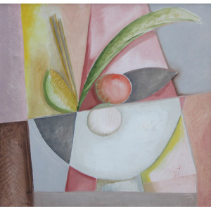 Tito de Alencastro - Fruteira com fundo rosa - Óleo sobre tela - 60 alt x 60 larg (cm) - acid - Obra com selo do atelier do artista no verso