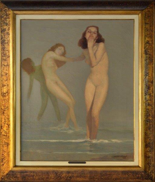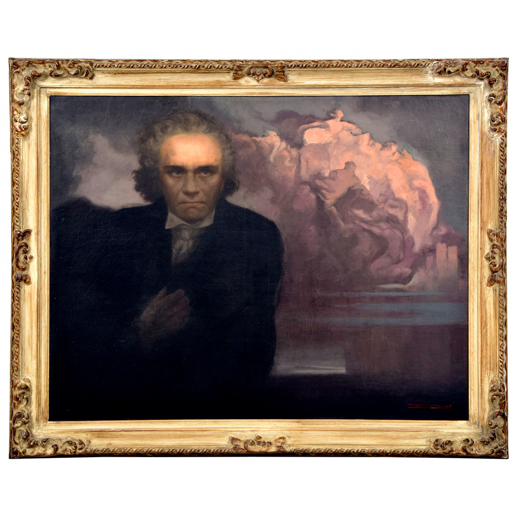 TONY KOEGL (Tirol, Áustria, 1898 - Brasil, 1978) "Ludwig van Beethoven" Óleo sobre tela ACID Medidas: 78,5 x 100 cm. Emoldurado: 94 x 117,5 cm. TONY KOEGL nasceu em Hall, cidade do Tirol, Áustria, no ano de 1898 e teria chegado ao Brasil em 1923. Formado pela Academia de Artes de Innsbruck, deixou seus estudos com a eclosão da I Guerra Mundial e passou a viajar pela Europa, passando por países como Alemanha, Rússia e Itália. No Brasil, residiu na cidade de São Paulo, provavelmente até o ano de 1928, quando teria conhecido Martinho Levy (1892-1967), filho de imigrantes alemães e responsável por trazer o artista para Limeira, em um período em que a cidade passava por uma grande efervescência cultural. Na cidade, KOEGL passou a receber diversas encomendas, sobretudo de retratos para famílias importantes, como os Levy e os Barros Camargo, além de outras instituições tradicionais limeirenses. No final da década de 1930, retornou para São Paulo, onde recebia incontáveis encomendas, sobretudo de retratos de membros das classes alta e média paulistanas. Em sua maioria, eram obras realizadas por meio de fotografias (muitas vezes pintando sobre elas) e com os retratados posando em seu ateliê. Na cidade, participou de algumas mostras solo e coletivas em galerias. Em linhas gerais, Koegl tinha um traço refinado, utilizando-se de cores claras e composições harmônicas. Com um forte viés acadêmico, seus nus, retratos, alegorias e obras de caráter político-partidário conseguiram cobrir um nicho importante nos mundos paulista e paulistano, no qual fervilhava os debates modernistas. O pintor faleceu em São Paulo, aproximadamente no ano de 1978, deixando um grande legado para a história da arte nacional de matriz imigrante.