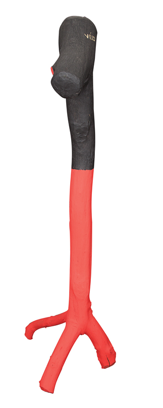Segundo o crítico Ronaldo Brito (1949), as obras de Véio fogem do virtuosismo mimético característico desse tipo de produção para aproximar-se de questões próprias à arte moderna e contemporânea3. Além da contenção do gesto e das cores impactantes, esses trabalhos questionam a própria noção de espaço da arte. Véio distribui suas estranhas figuras pelo sítio, como se fossem habitantes do local e refere-se a elas como portadoras de história e vida. Mas a aparência dessas esculturas transmuta-se facilmente, dependendo do local e da posição em que se encontram. “Deitada, estava pedindo socorro; em pé, ela quis me abraçar”4, detalha o artista ao falar das sensações que a madeira de origem lhe transmite e que, de certa forma, são preservadas na peça final.