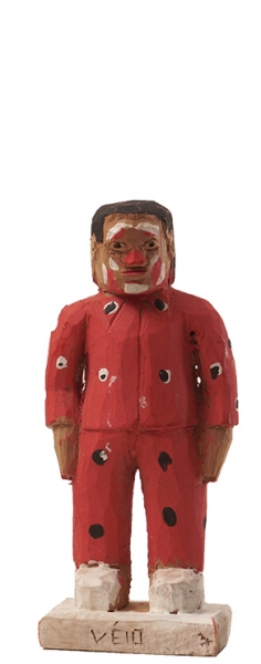 “Não sou de copiar, como papagaio”, afirma Véio, que nunca estudou arte, tampouco tem mestres, mas sempre se dedicou a ela com afinco. Ainda menino, nos intervalos do trabalho na roça, molda com cera de abelha pequenas figuras. Por considerar a atividade como “brincar de boneca”, desmancha as esculturas quando se aproxima um adulto. Com o tempo, abandona a cera e adota a madeira como matéria-prima. Mas não derruba árvores para obtê-la. Pelo contrário: seu instinto preservacionista leva-o a adquirir o último trecho de mata virgem da região. “Dou vida ao que já está morto”, diz1.