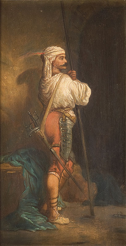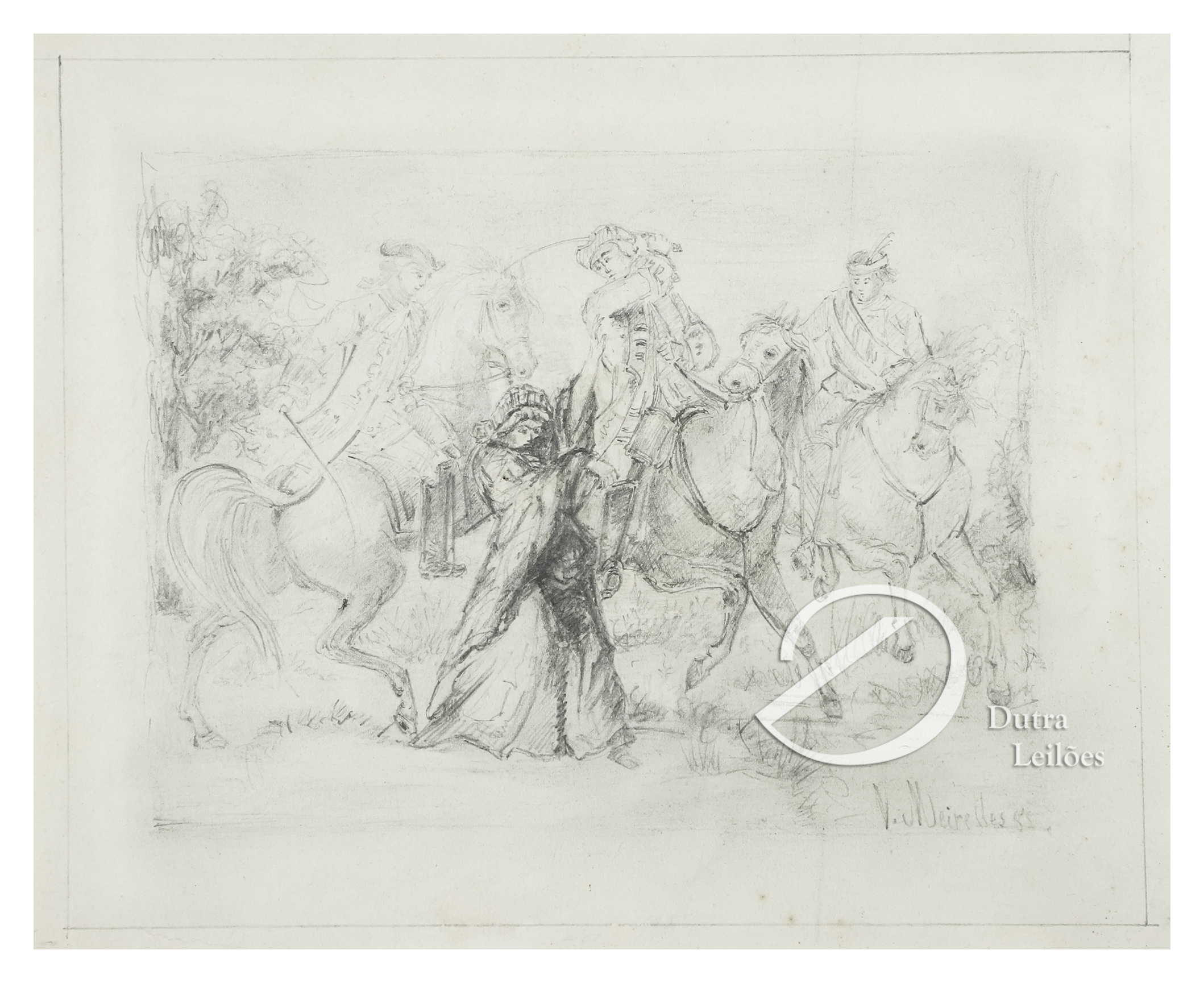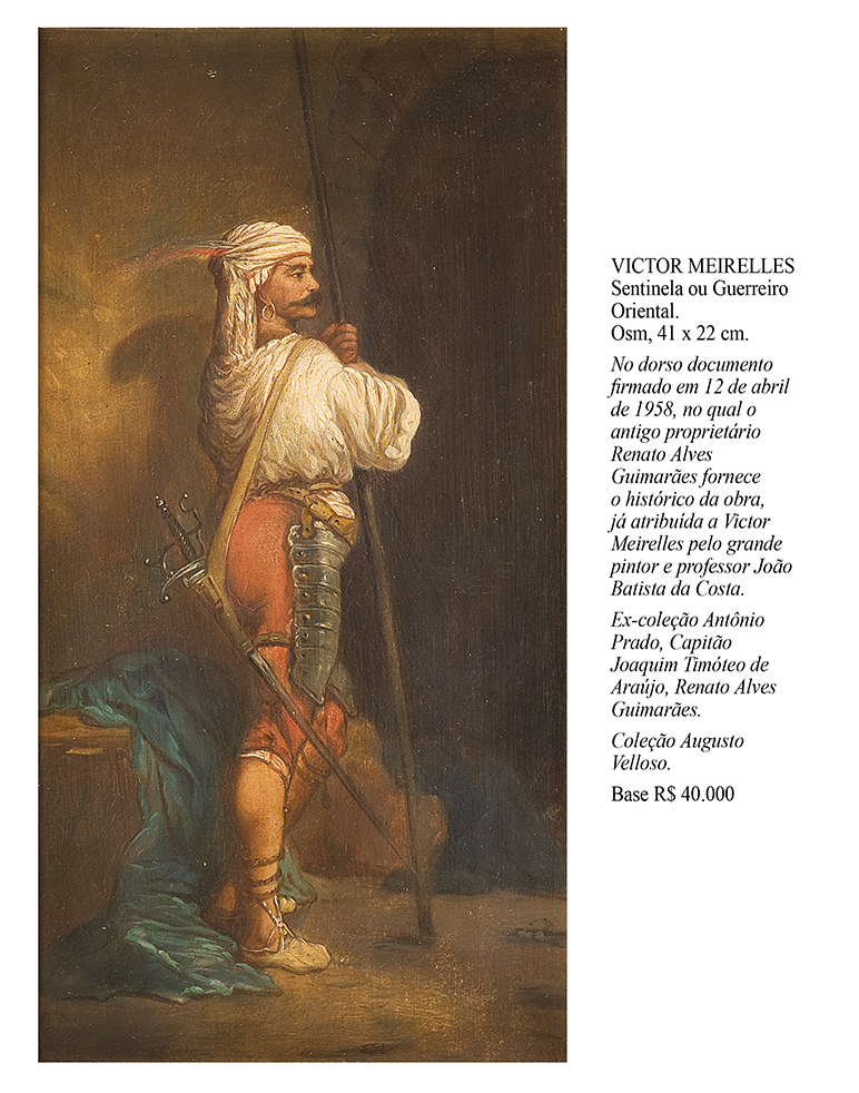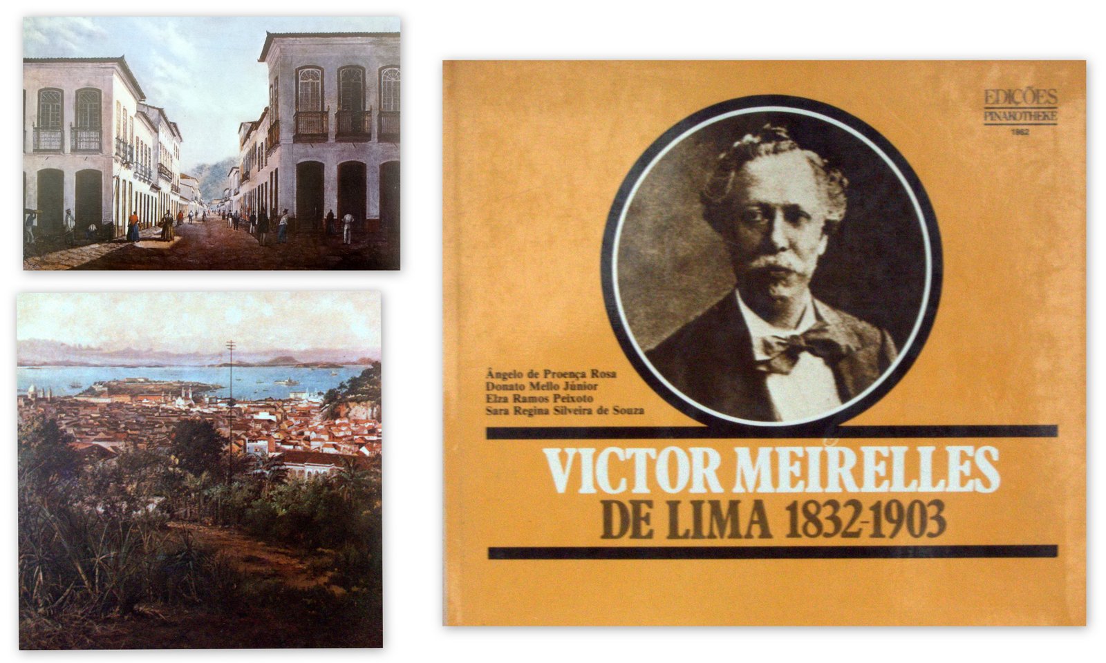 Victor Meirelles de Lima (Nossa Senhora do Desterro, atual Florianópolis SC 1832 - Rio de Janeiro RJ 1903). Pintor, desenhista, professor. Inicia seus estudos artísticos por volta de 1838, com o engenheiro argentino Marciano Moreno. No ano de 1847, muda-se para o Rio de Janeiro e se matricula na Academia Imperial de Belas Artes - Aiba onde, em 1849, inicia o curso de pintura histórica. Em 1852 ganha o prêmio de viagem ao exterior e no ano seguinte segue para a Itália. Em Roma freqüenta, em 1854, as aulas de Tommaso Minardi (1787 - 1871) e, posteriormente de Nicola Consoni (1814 - 1884), com quem realiza uma série de estudos com modelo vivo. Com a prorrogação da pensão que lhe fora concedida continua sua formação estudando em Paris onde, em 1857, matricula-se na École Superiéure des Beaux-Arts [Escola Superior de Belas Artes], freqüentando as aulas de Leon Cogniet (1794-1880) e, em seguida, recebendo orientações de seu discípulo Andrea Gastaldi (1810-1889). Durante o período em que permanece no exterior corresponde-se com Porto Alegre (1806 - 1879). Retorna ao Brasil em 1861 e, um ano depois, é nomeado professor de pintura histórica da Aiba. Entre os anos de 1869 e 1872 executa duas grandes telas, Passagem do Humaitá e Batalha de Riachuelo. Em 1879 participa da Exposição Geral de Belas Artes, expondo a Batalha dos Guararapes ao lado da Batalha do Avaí de Pedro Américo (1843 - 1905). A apresentação das duas obras gera grande polêmica e um intenso debate no meio artístico. A partir de 1886 passa a se dedicar à execução de panoramas. Entre eles destacam-se: o Panorama Circular da Cidade do Rio de Janeiro, feito na Bélgica, juntamente com Henri Langerock (1830 - 1915) e Entrada da Esquadra Legal no Porto do Rio de Janeiro em 1894, produzida nesse mesmo ano.