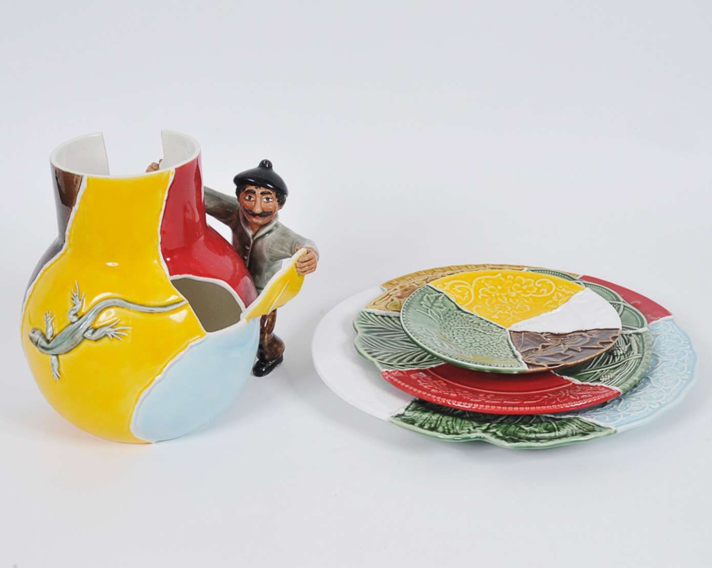 Vik Muniz/Bordello Pinheiro - O colador de cacos - Lote composto por 4 peças em faiança nacional pintada a mão e decorada em relevos sendo, um vaso e três pratos ricamente esmaltados - Tiragem de 250 - Assinatura base