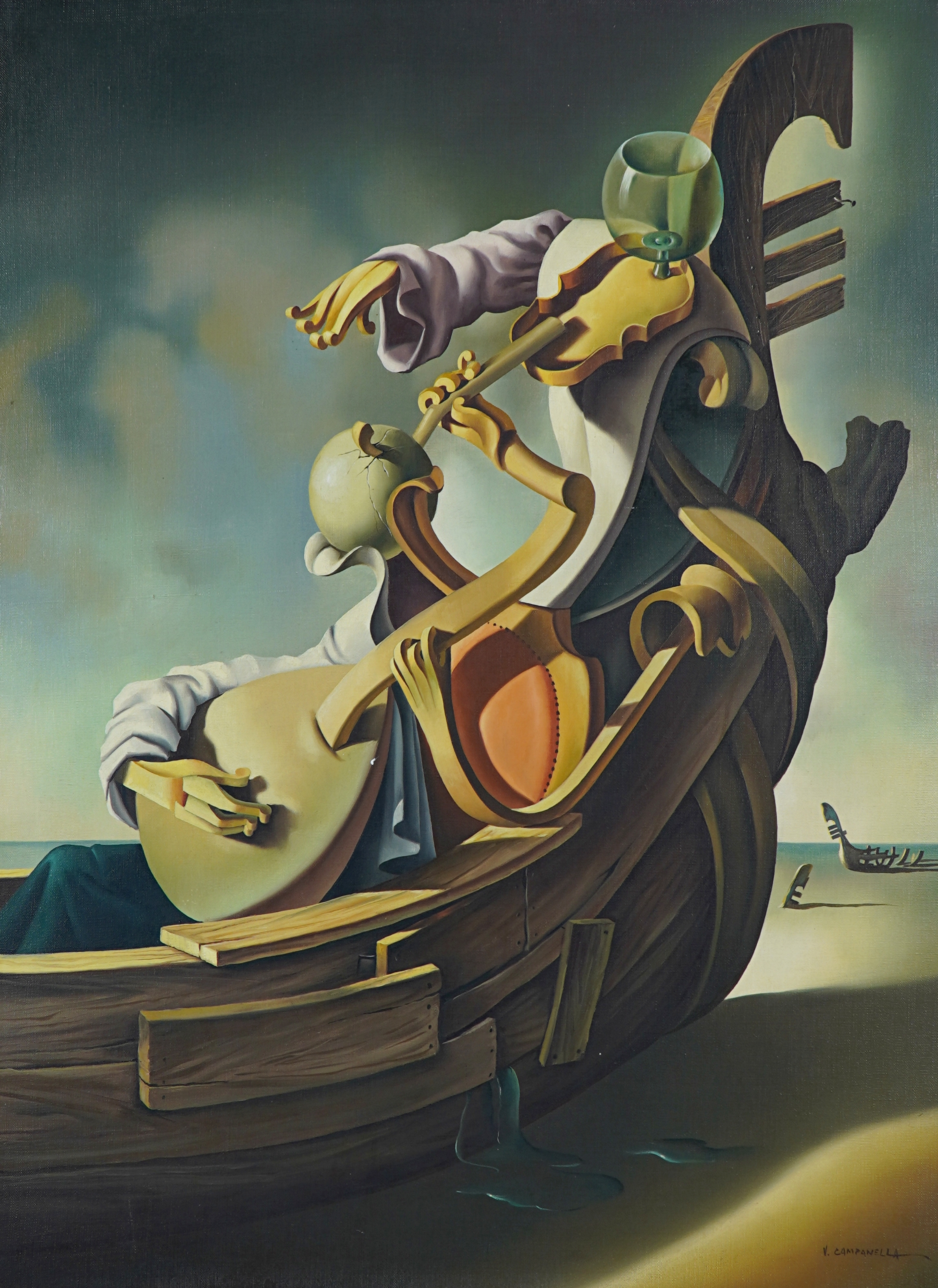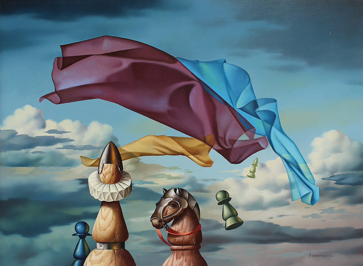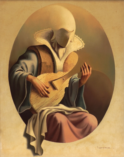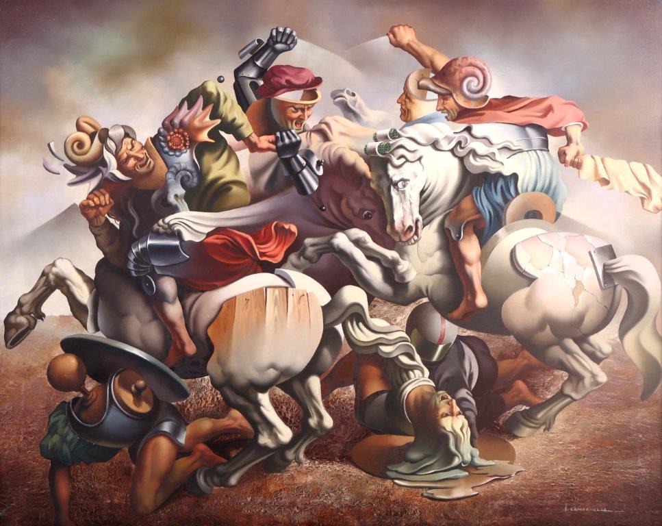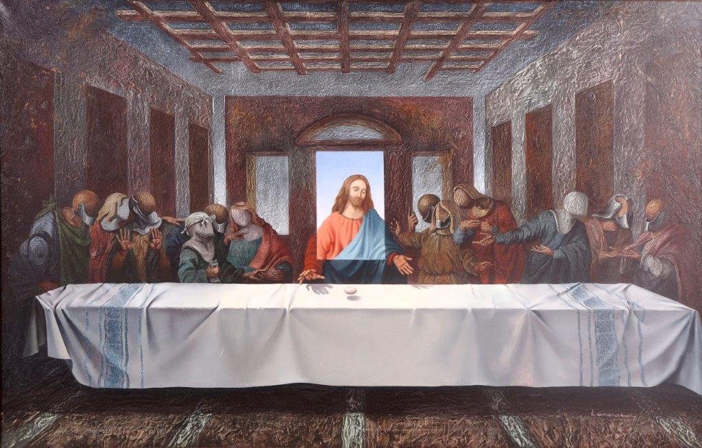 VITO CAMPANELLA (1932) – OST- “La Última Cena”, datado de 1982, composição figurativa de inspiração surrealista. Artista italiano radicado na Argentina, com formação na Itália e influências de Giorgio de Chirico e Salvador Dalí, ligado ao movimento artístico latino-americano. Ass. CID. Dimensões: 62 × 98 cm.