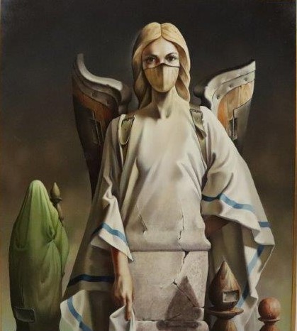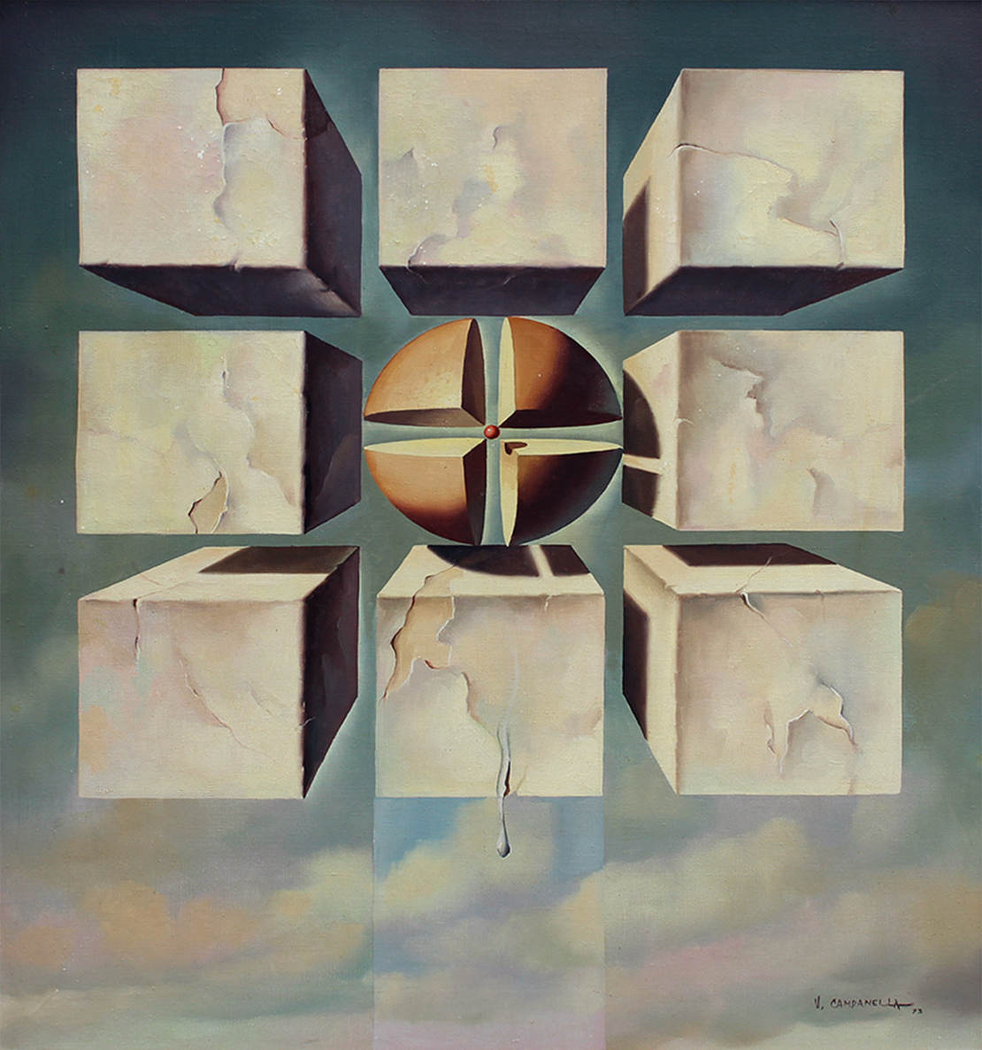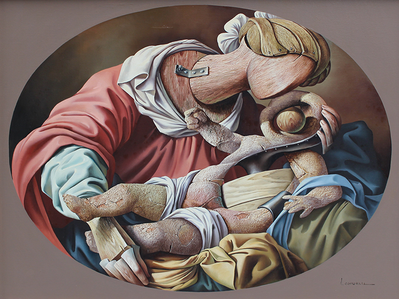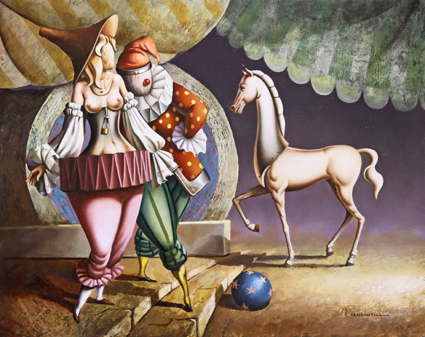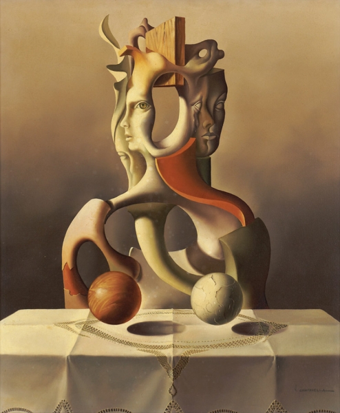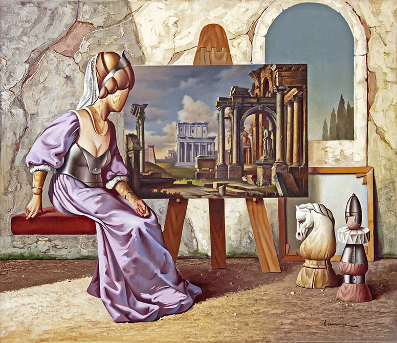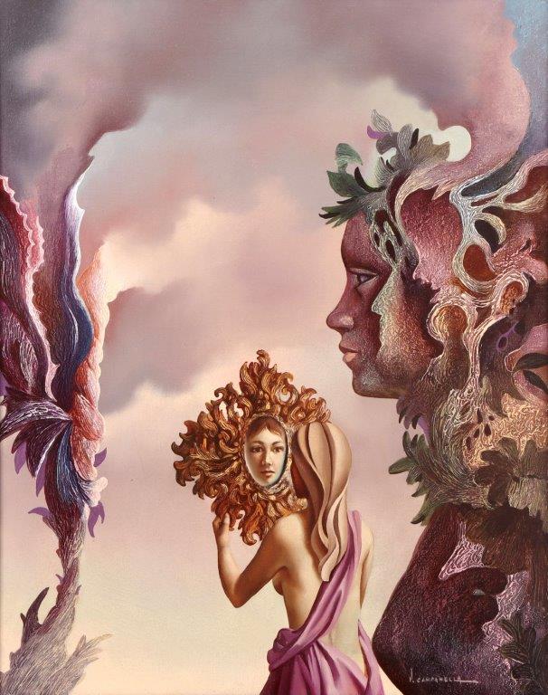 VITO CAMPANELLA (1932) – OST- “La Última Cena”, datado de 1982, composição figurativa de inspiração surrealista. Artista italiano radicado na Argentina, com formação na Itália e influências de Giorgio de Chirico e Salvador Dalí, ligado ao movimento artístico latino-americano. Ass. CID. Dimensões: 62 × 98 cm.