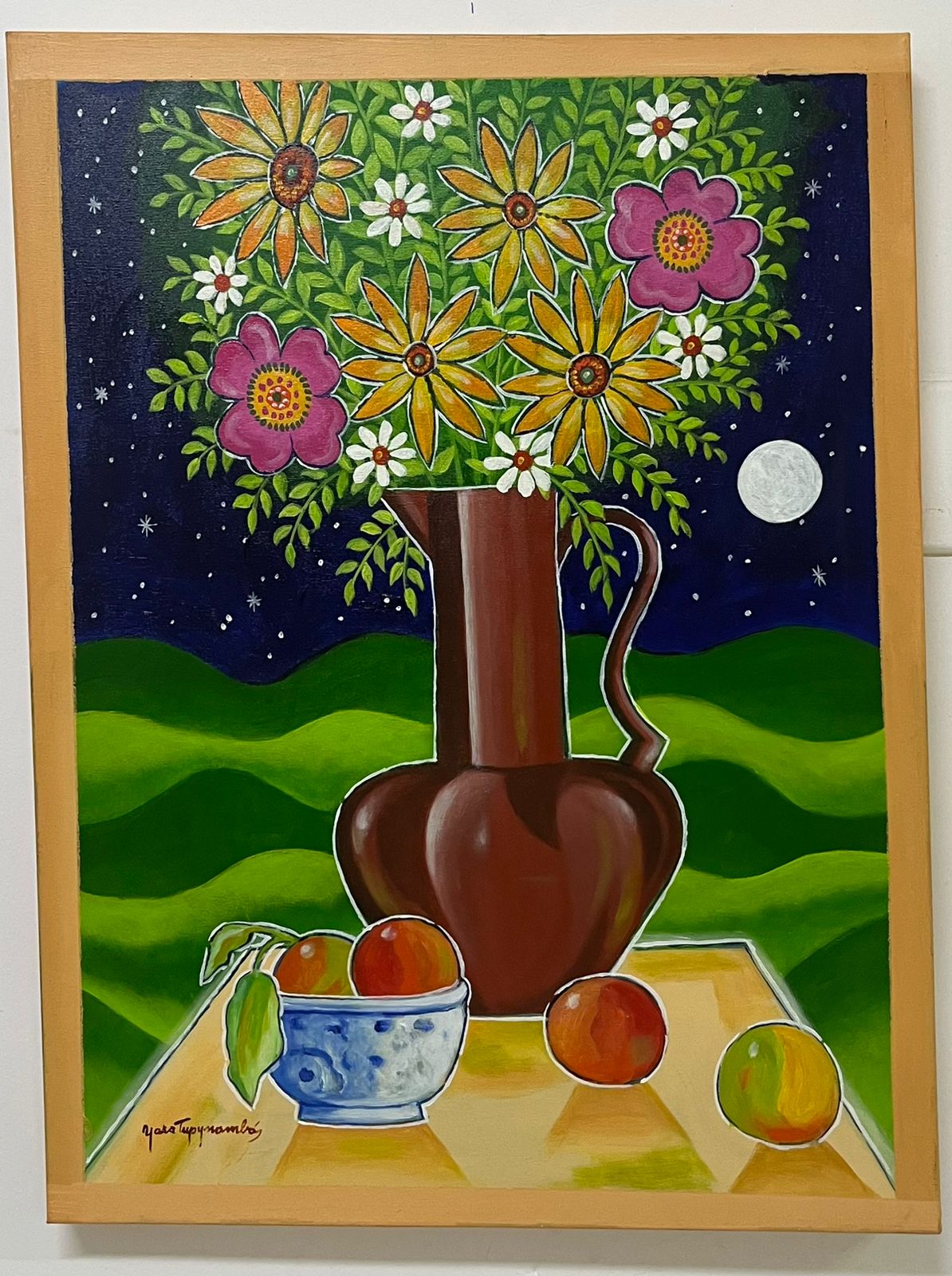 Yara Tupynambá - Flores, natureza morta e noite estrelada com montanhas de Minas - 80 x 60 cm - Acrílica sobre tela - Assinatura canto inferior esquerdo
