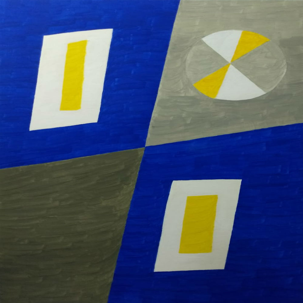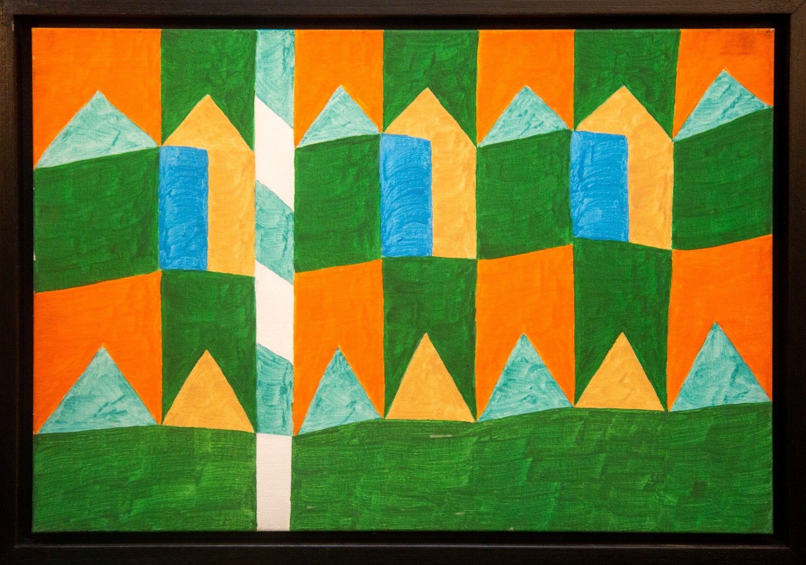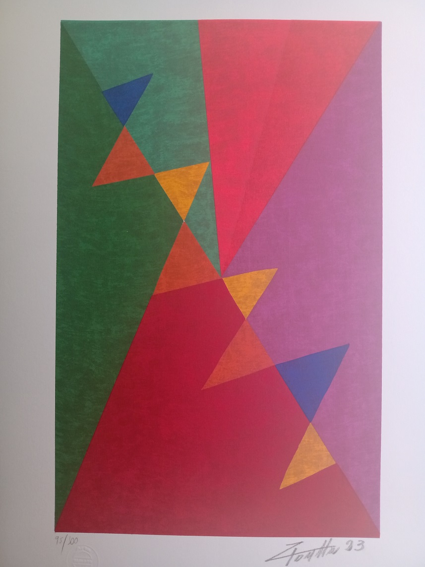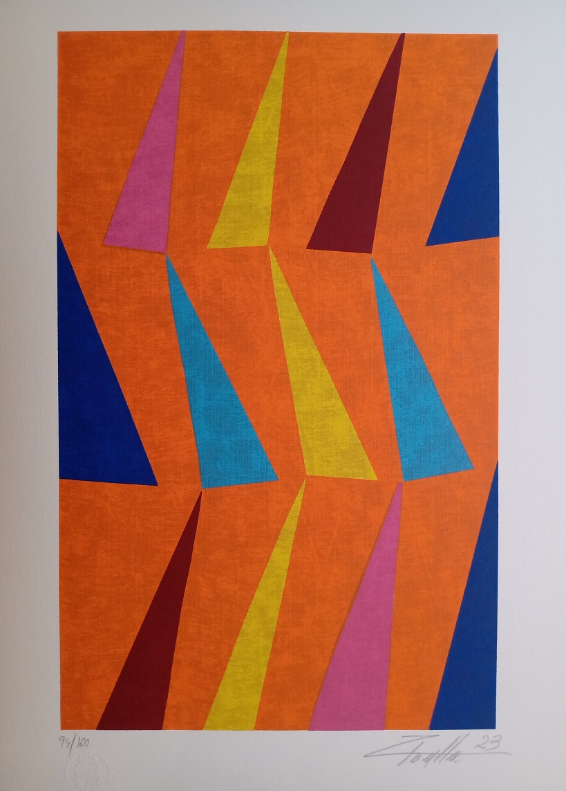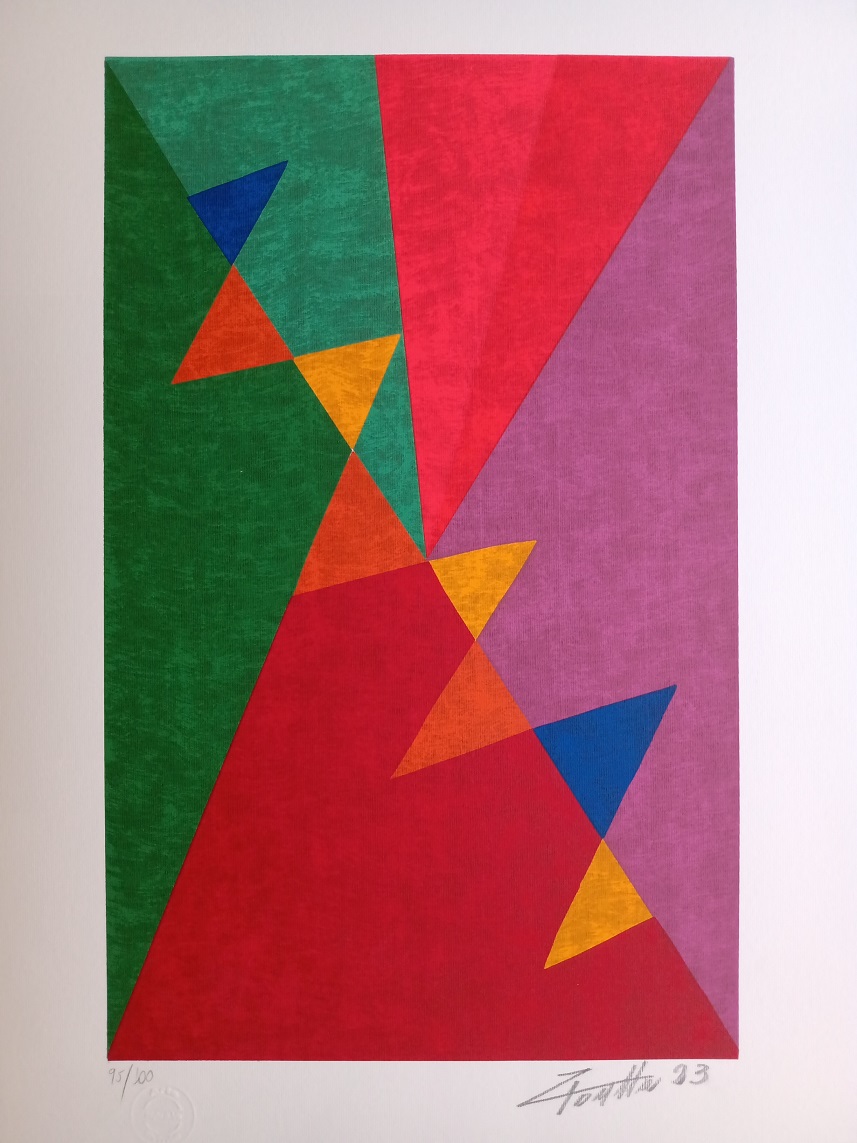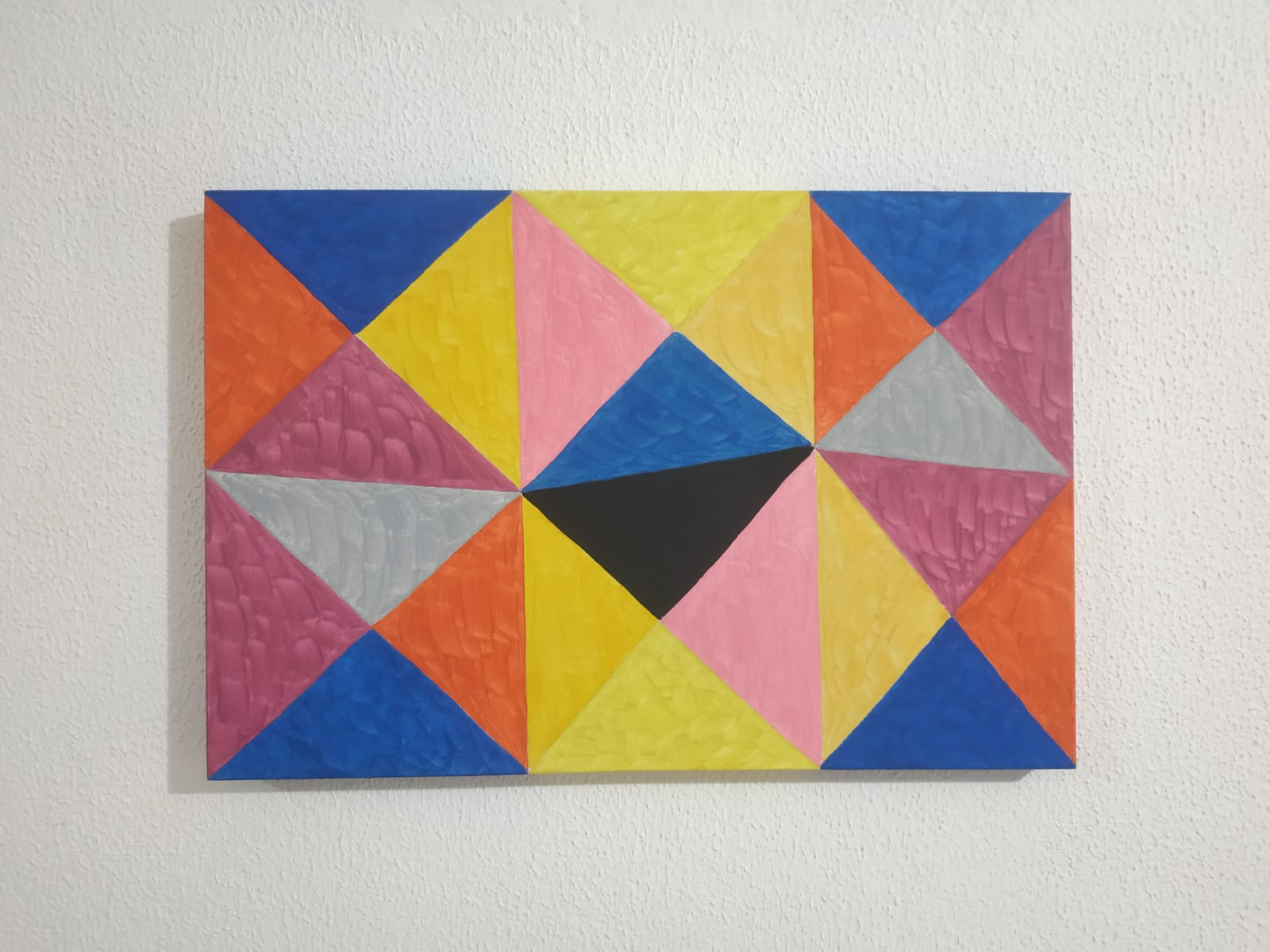 Sua obra atrai primeiro pelas cores e formas, depois para a sensação visual de que a pintura desloca-se do fundo.