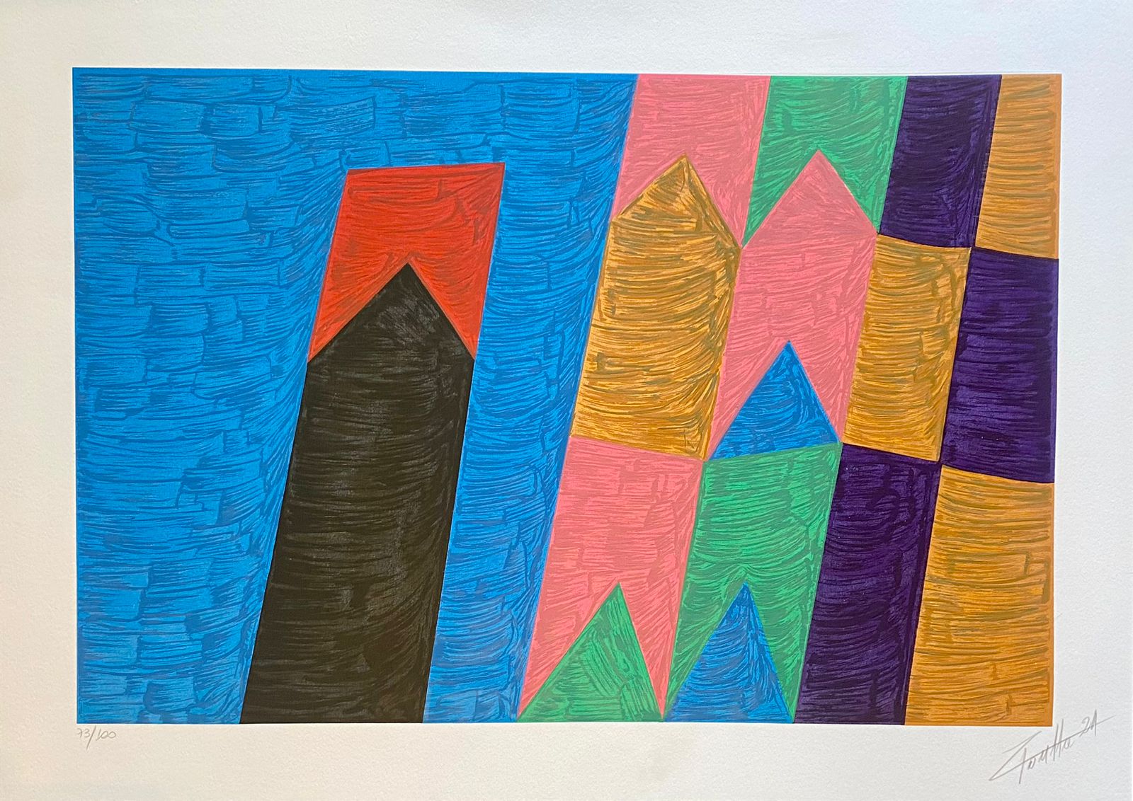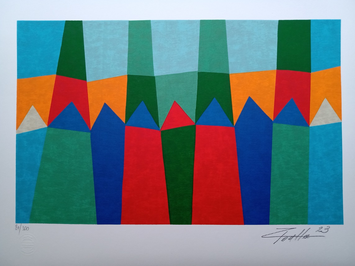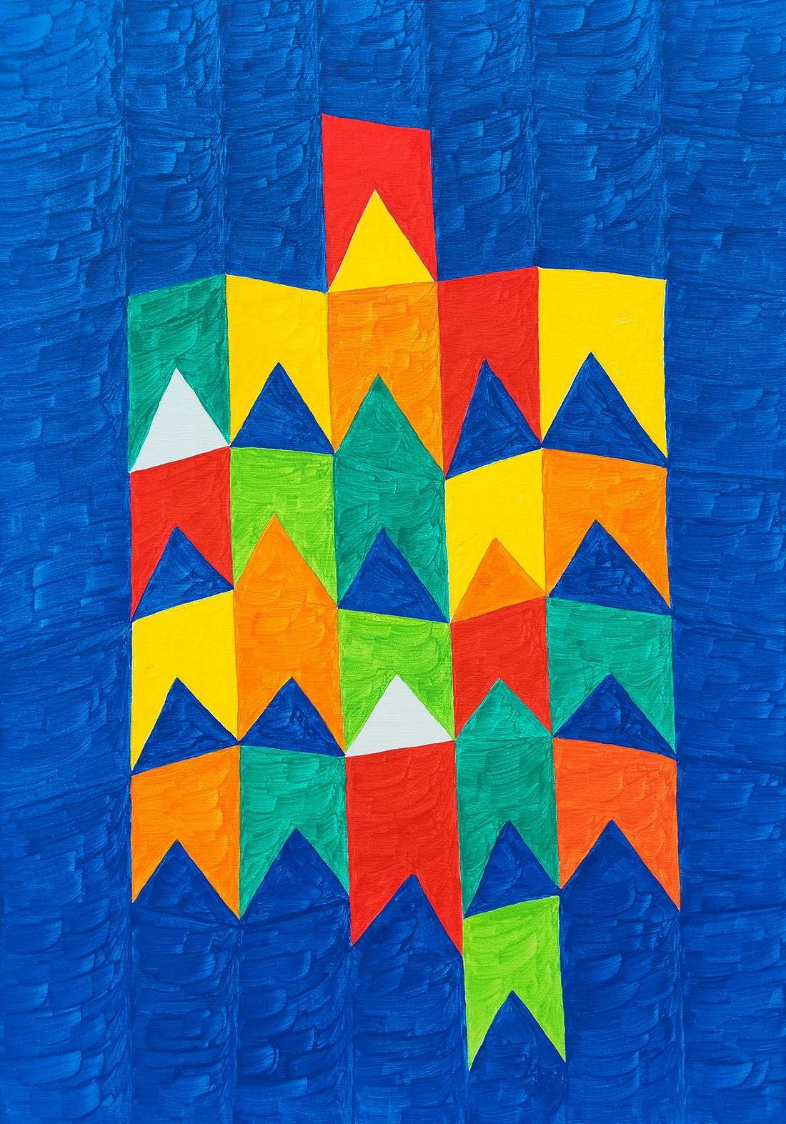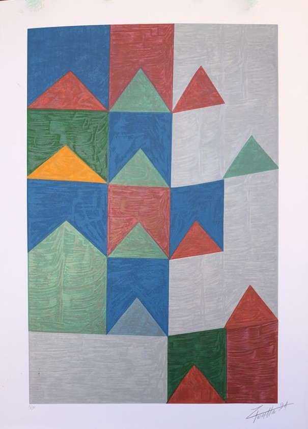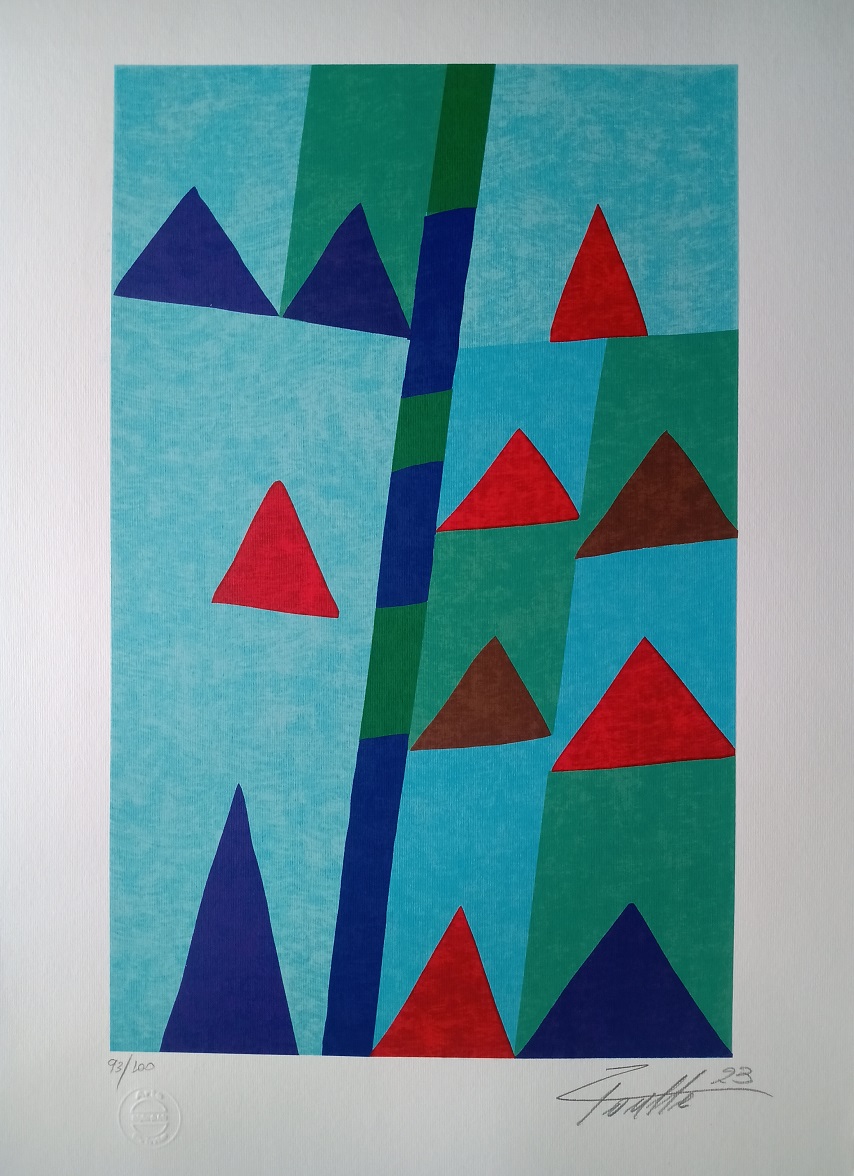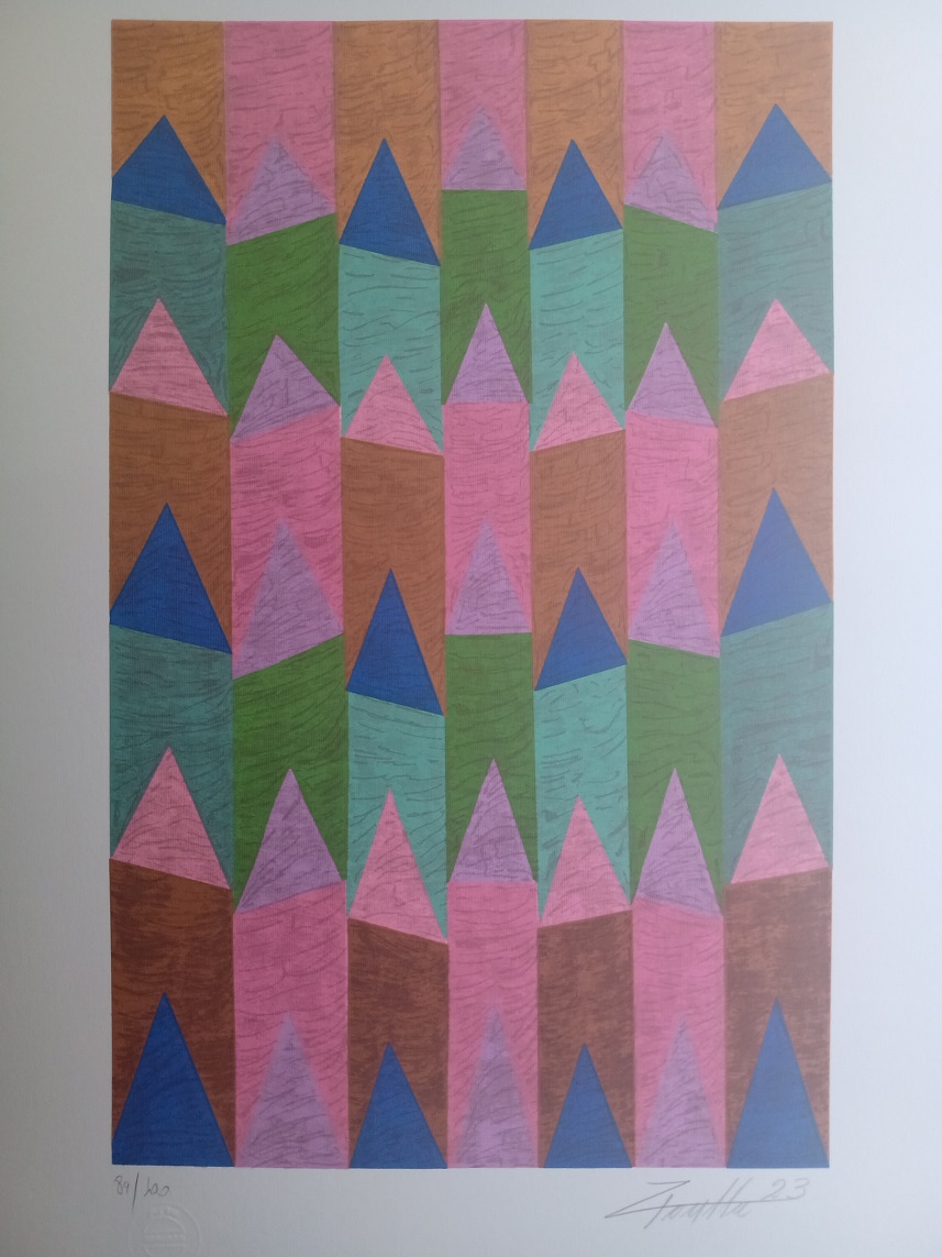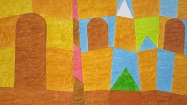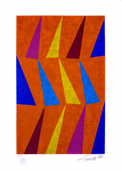 Sua obra atrai primeiro pelas cores e formas, depois para a sensação visual de que a pintura desloca-se do fundo.
