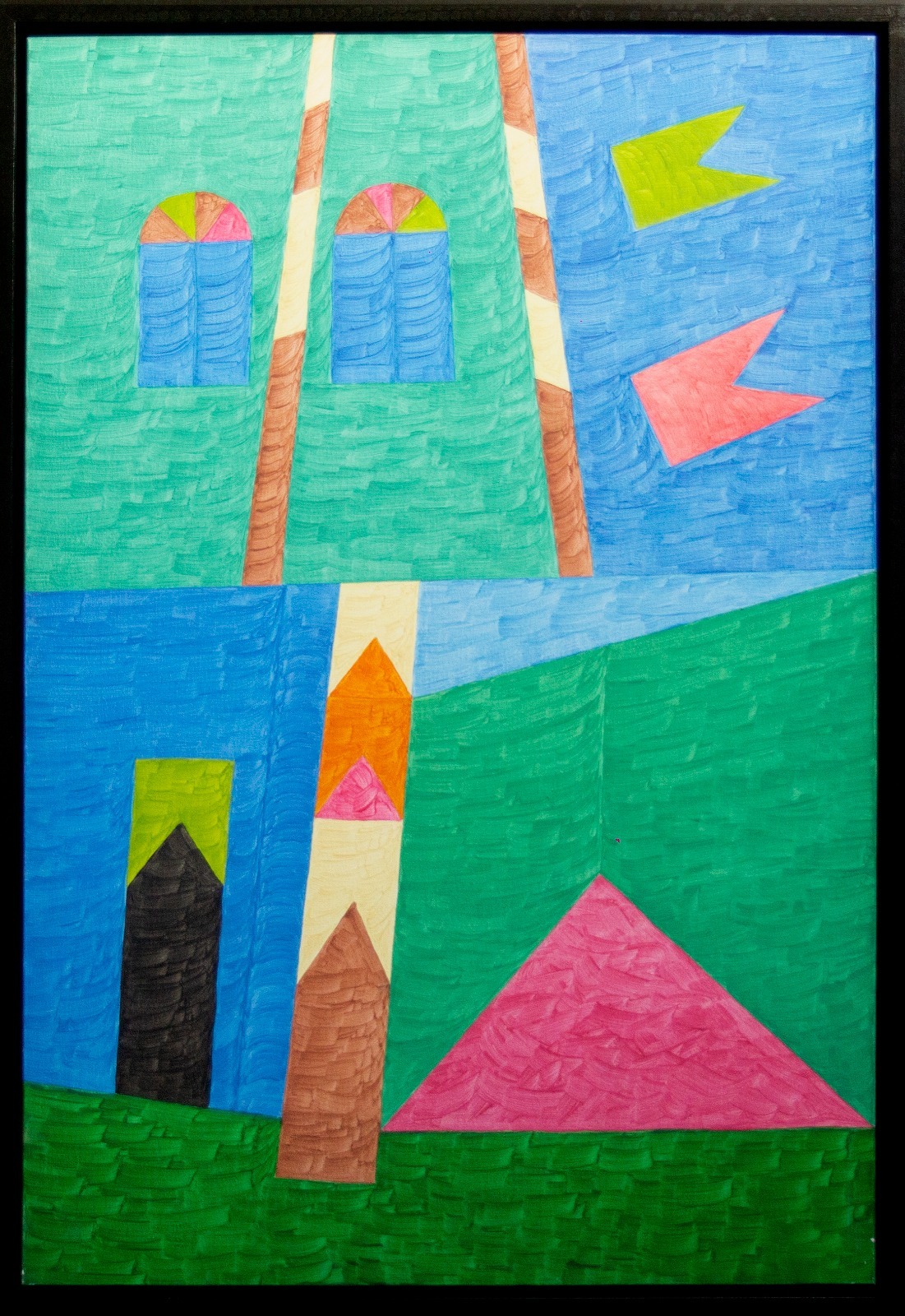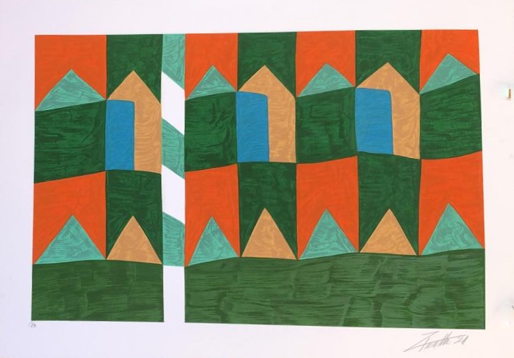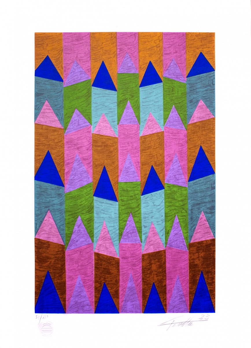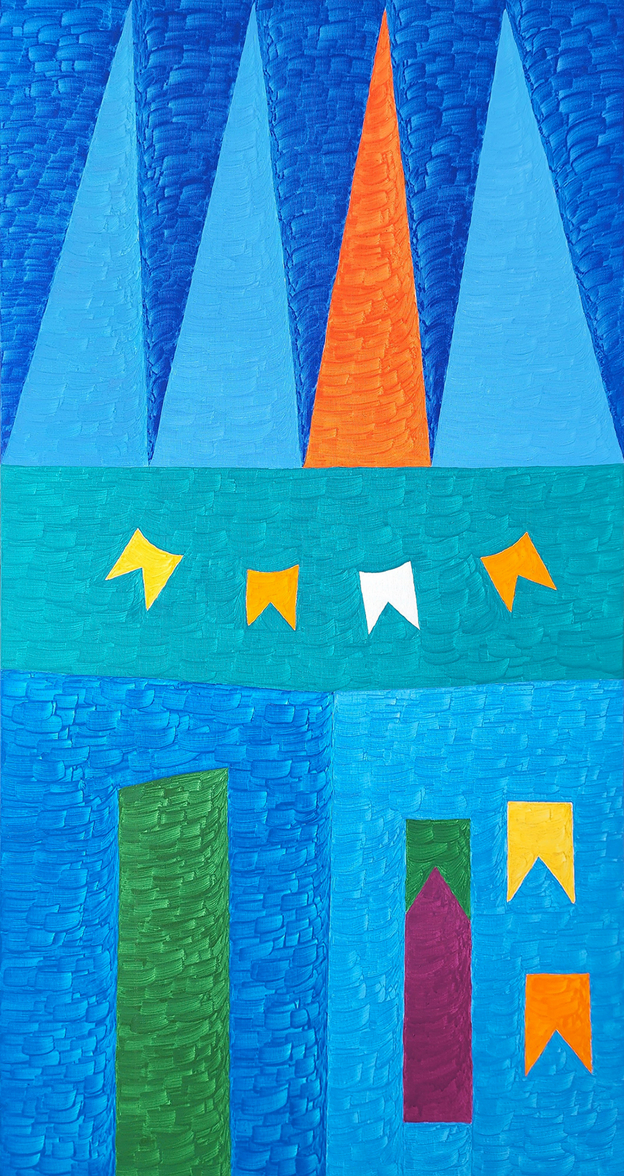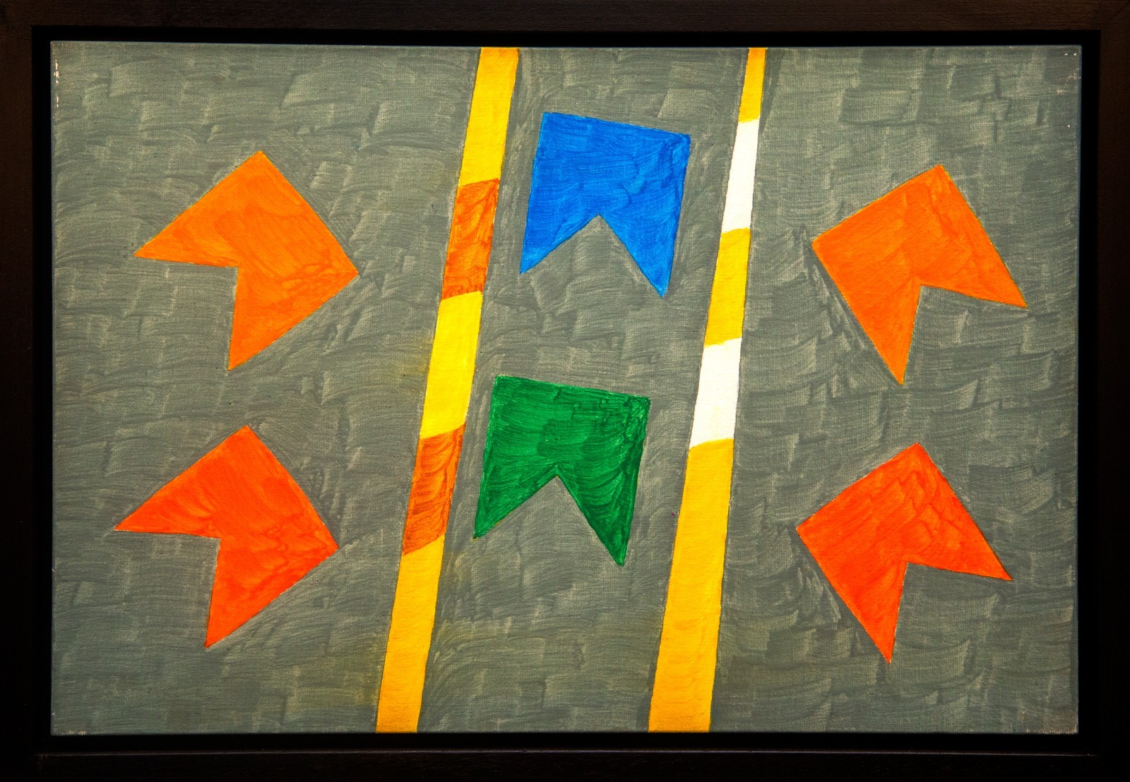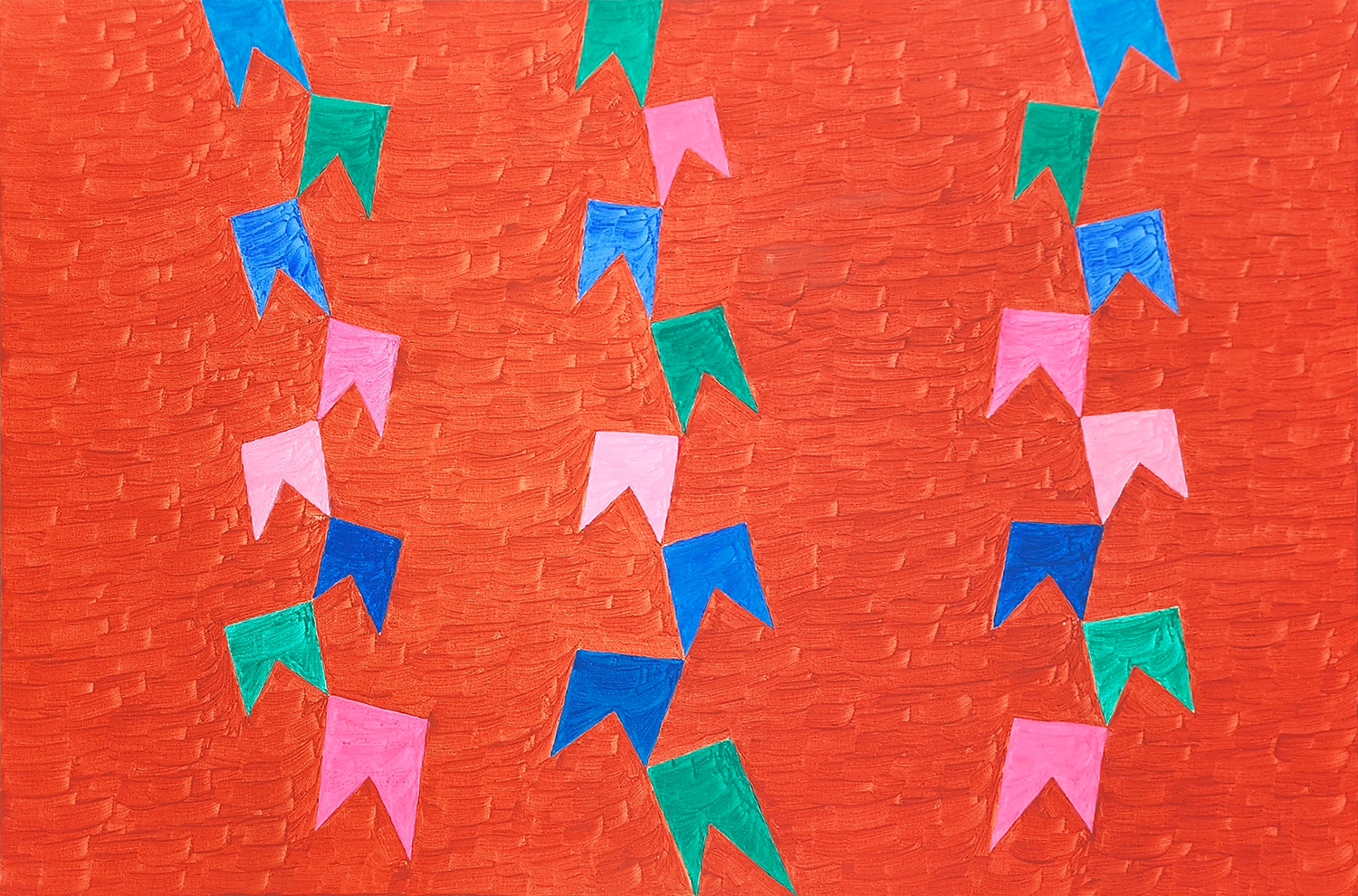 Sua obra atrai primeiro pelas cores e formas, depois para a sensação visual de que a pintura desloca-se do fundo.