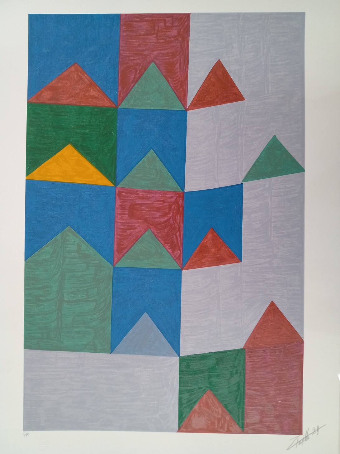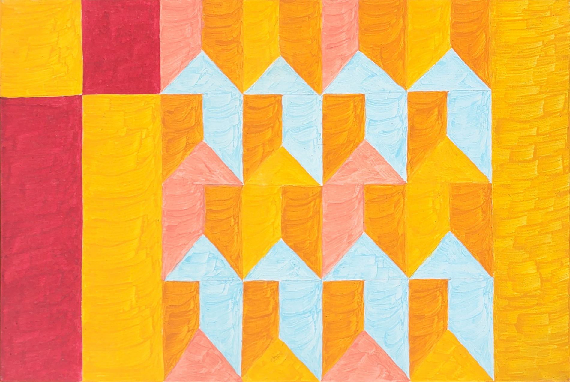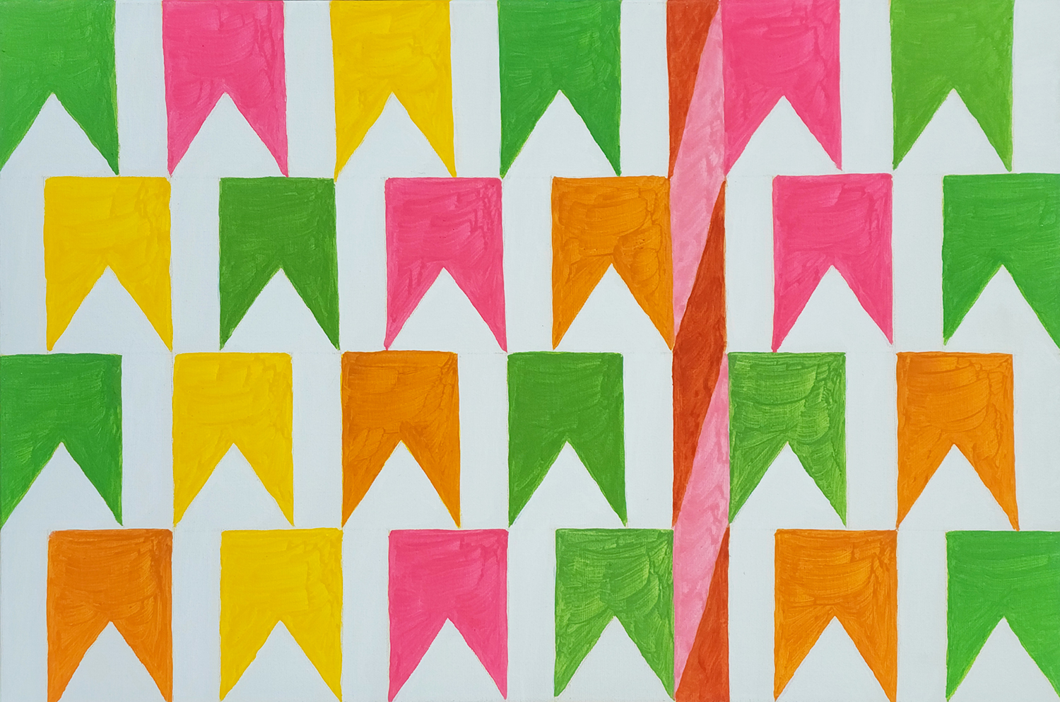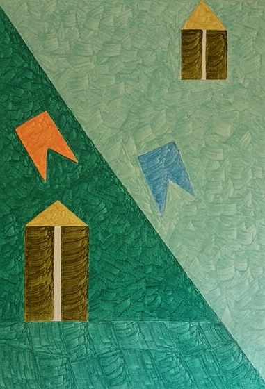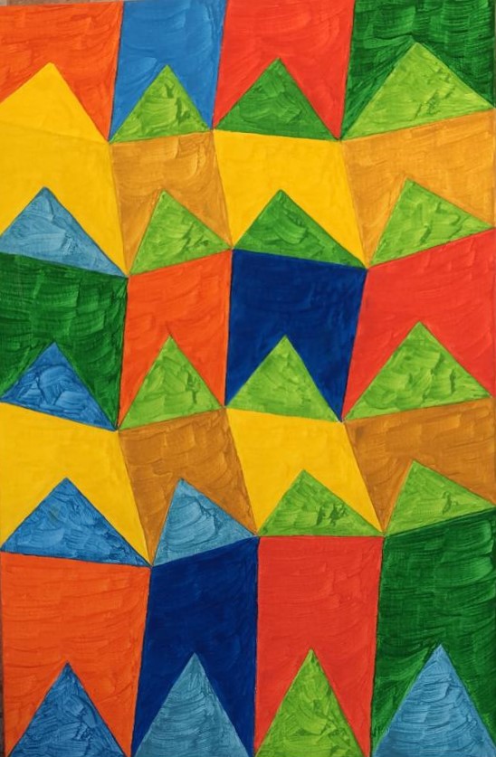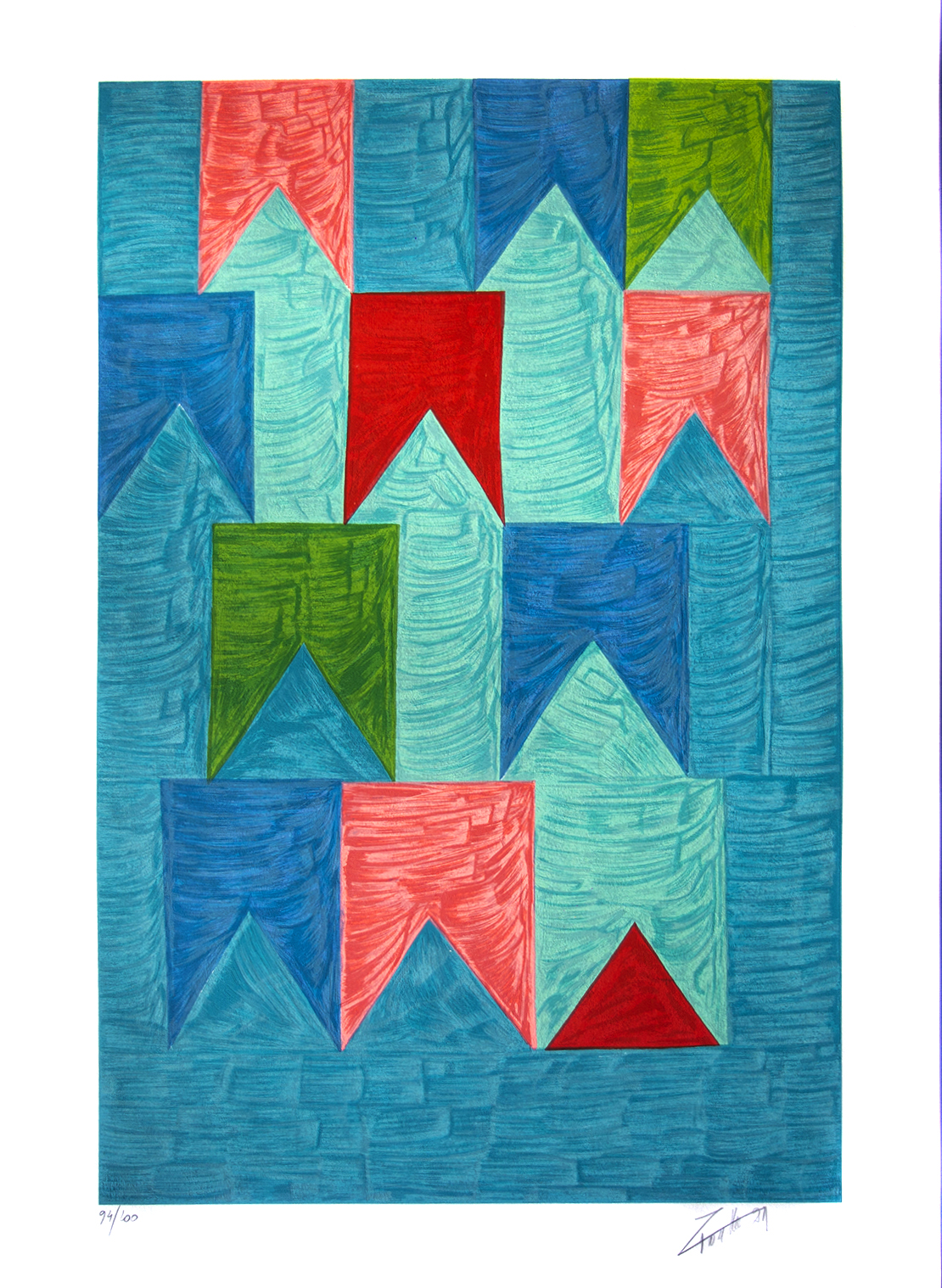 Sua obra atrai primeiro pelas cores e formas, depois para a sensação visual de que a pintura desloca-se do fundo.