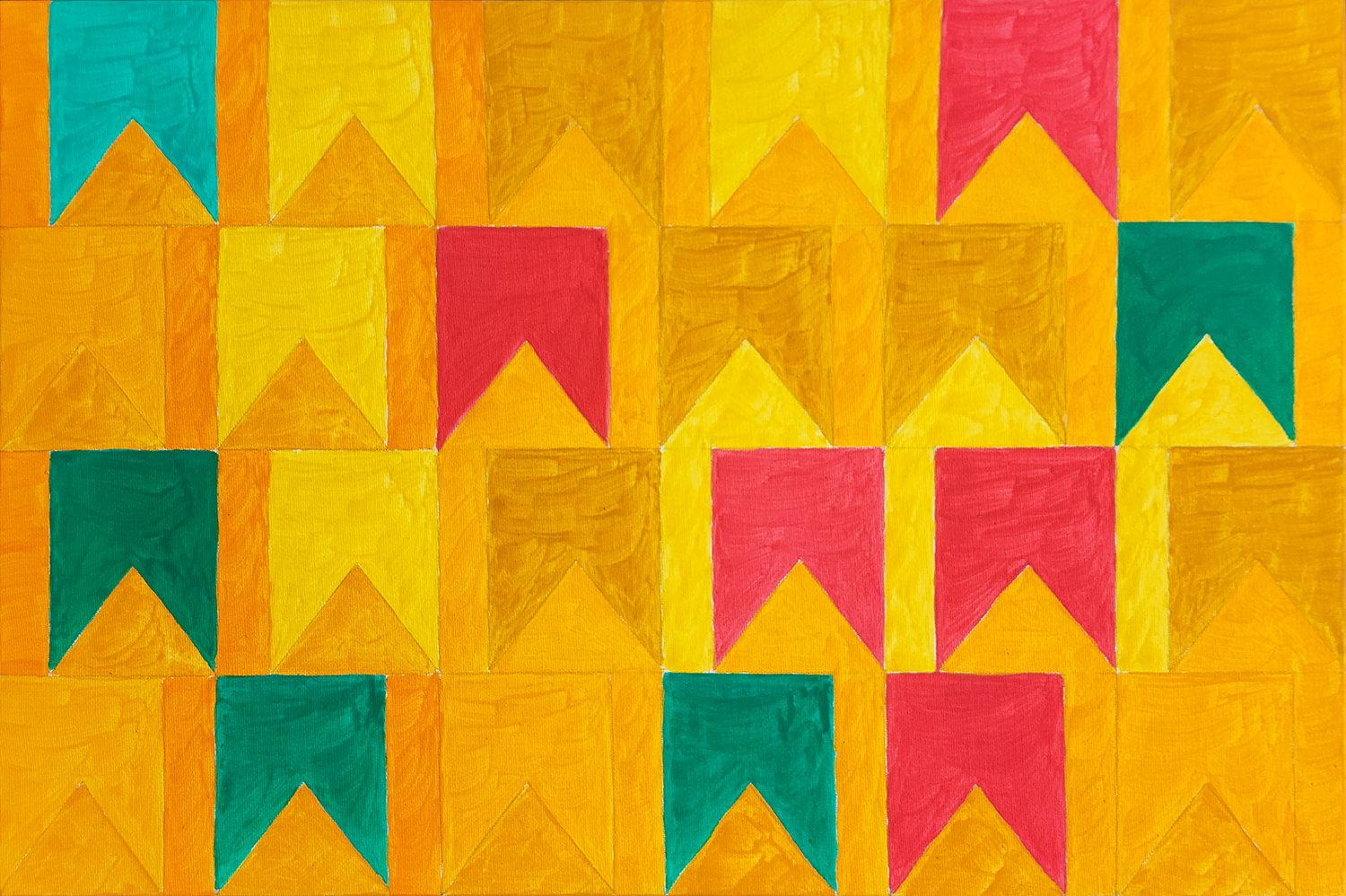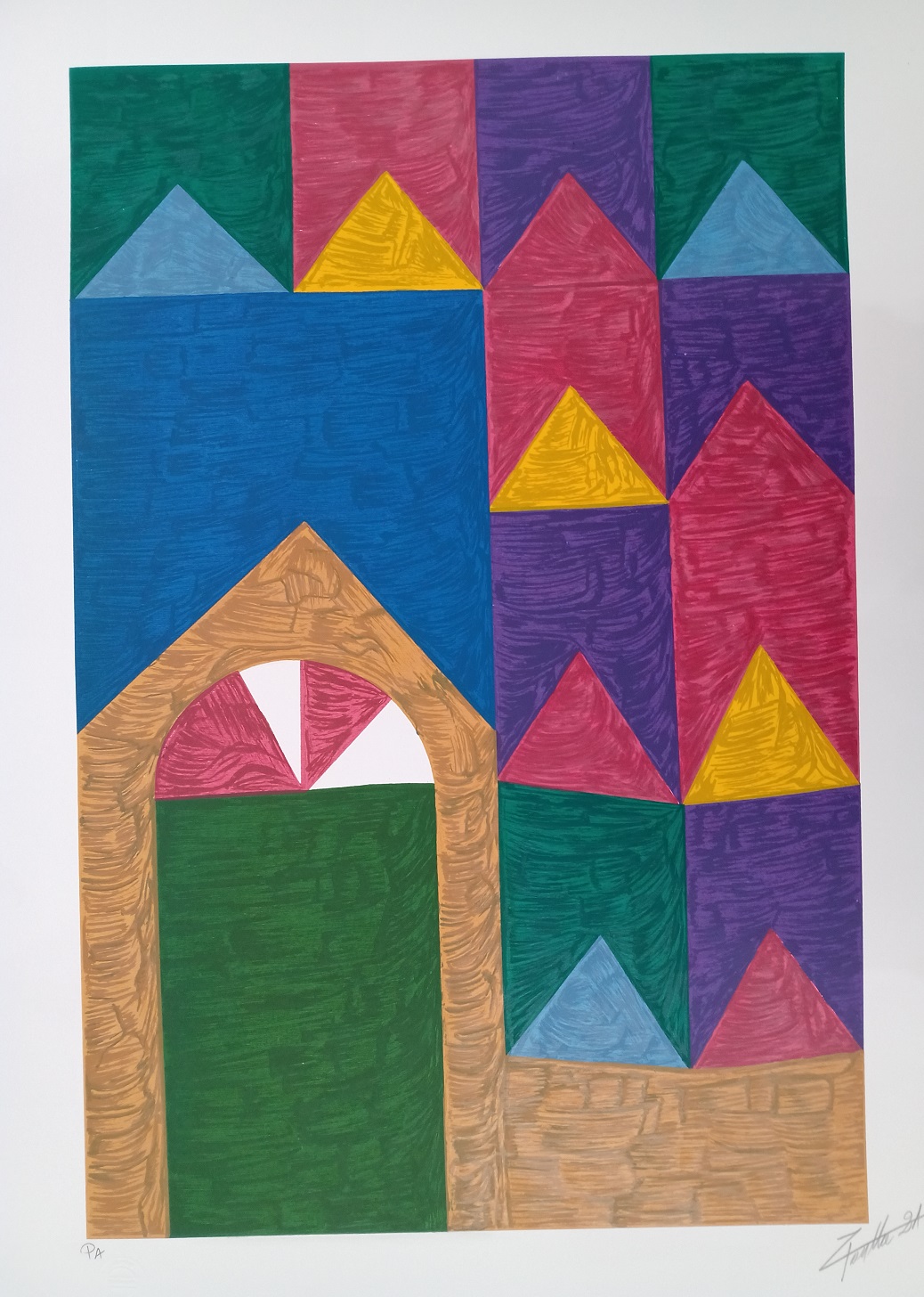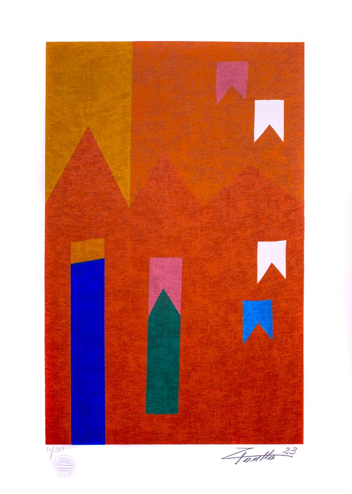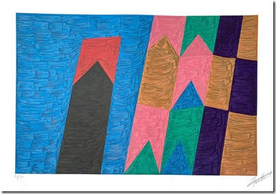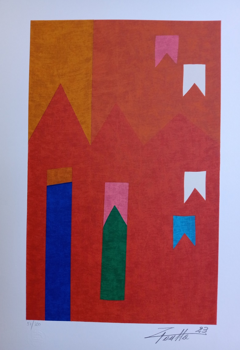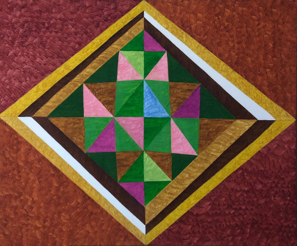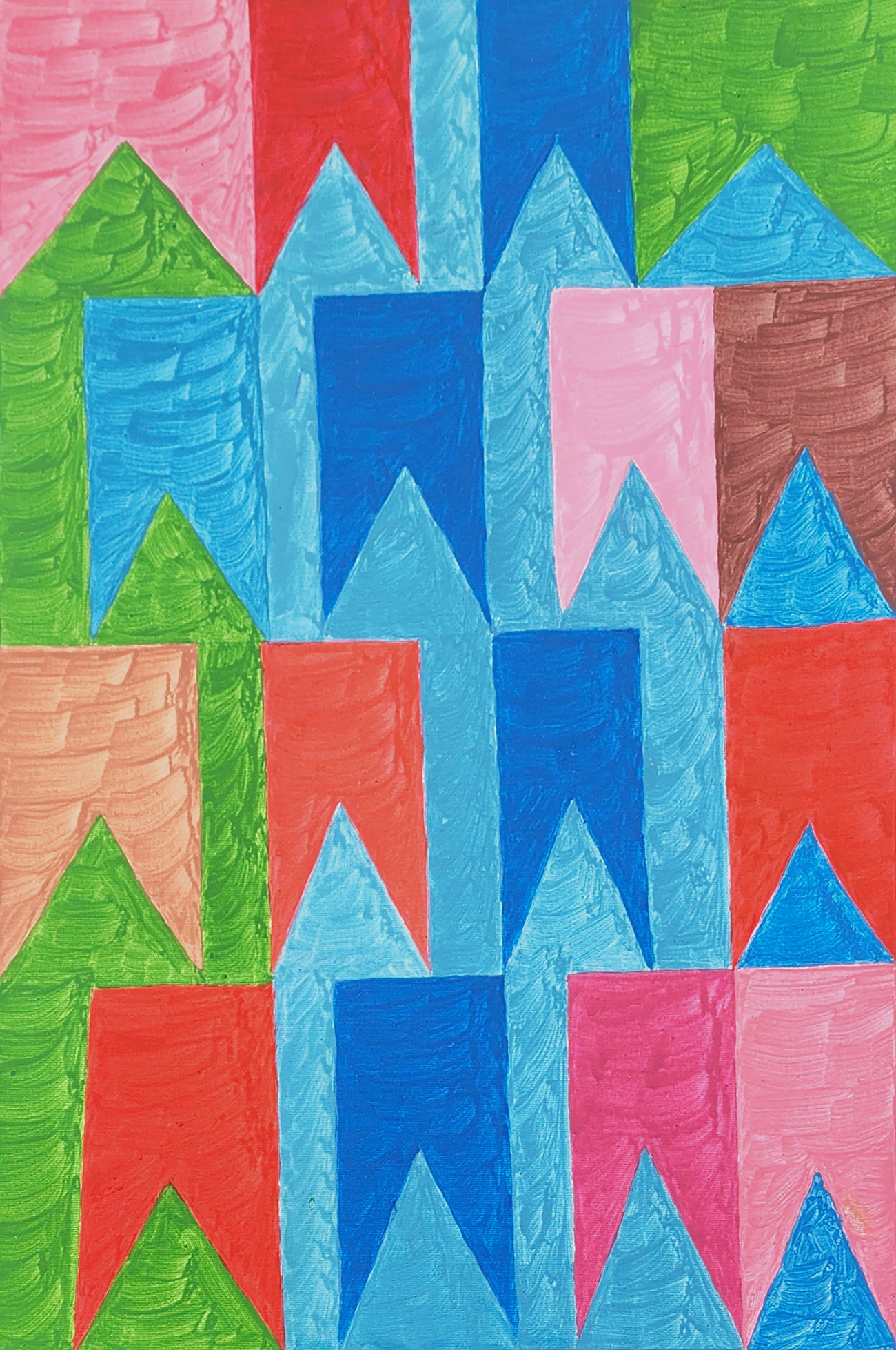 Sua obra atrai primeiro pelas cores e formas, depois para a sensação visual de que a pintura desloca-se do fundo.