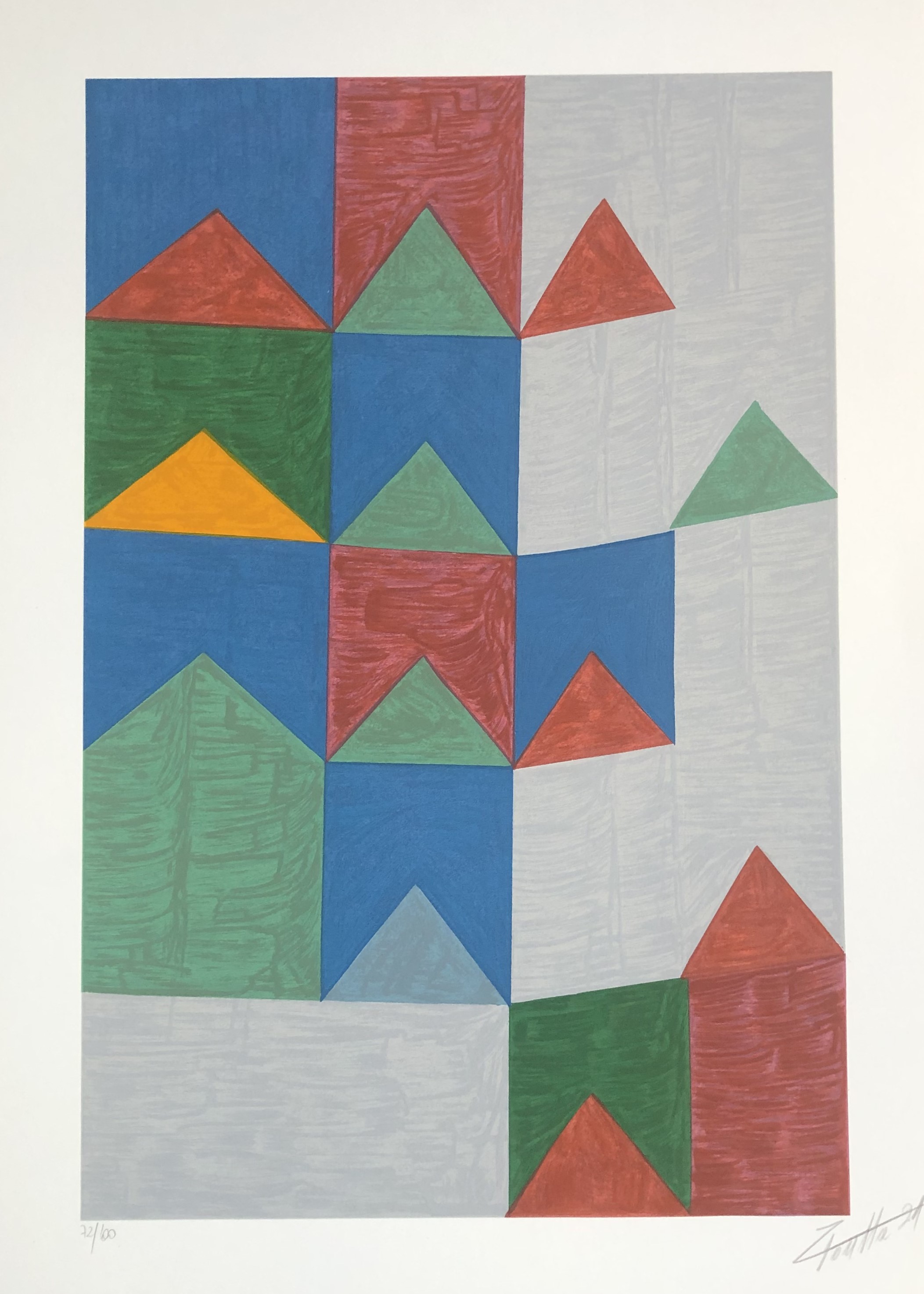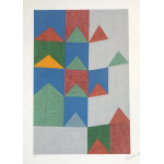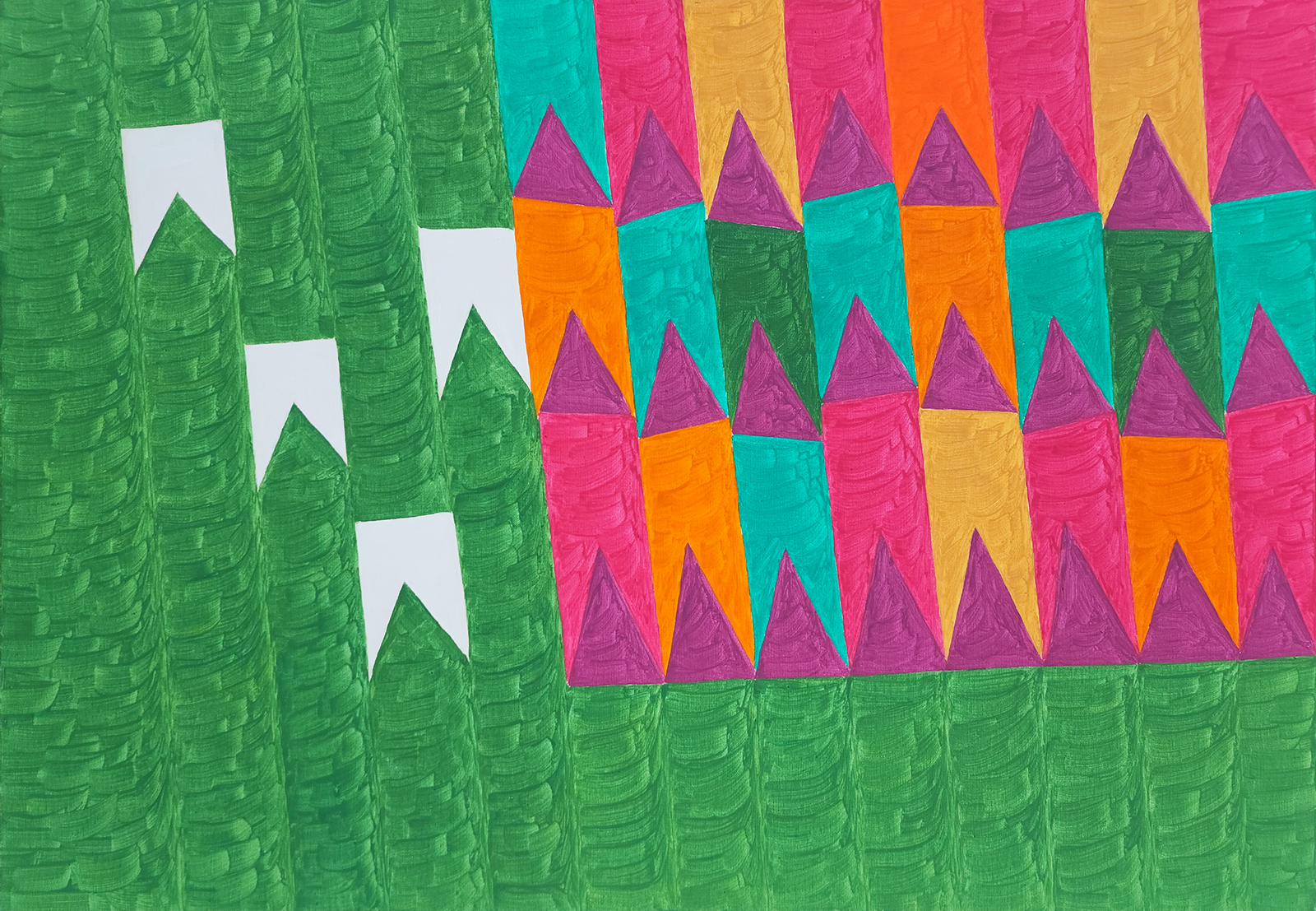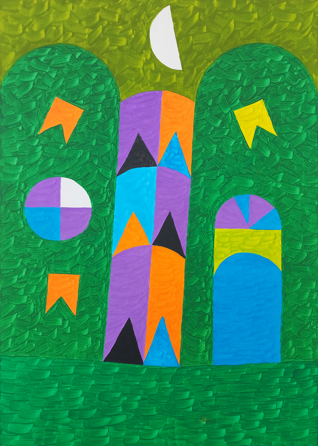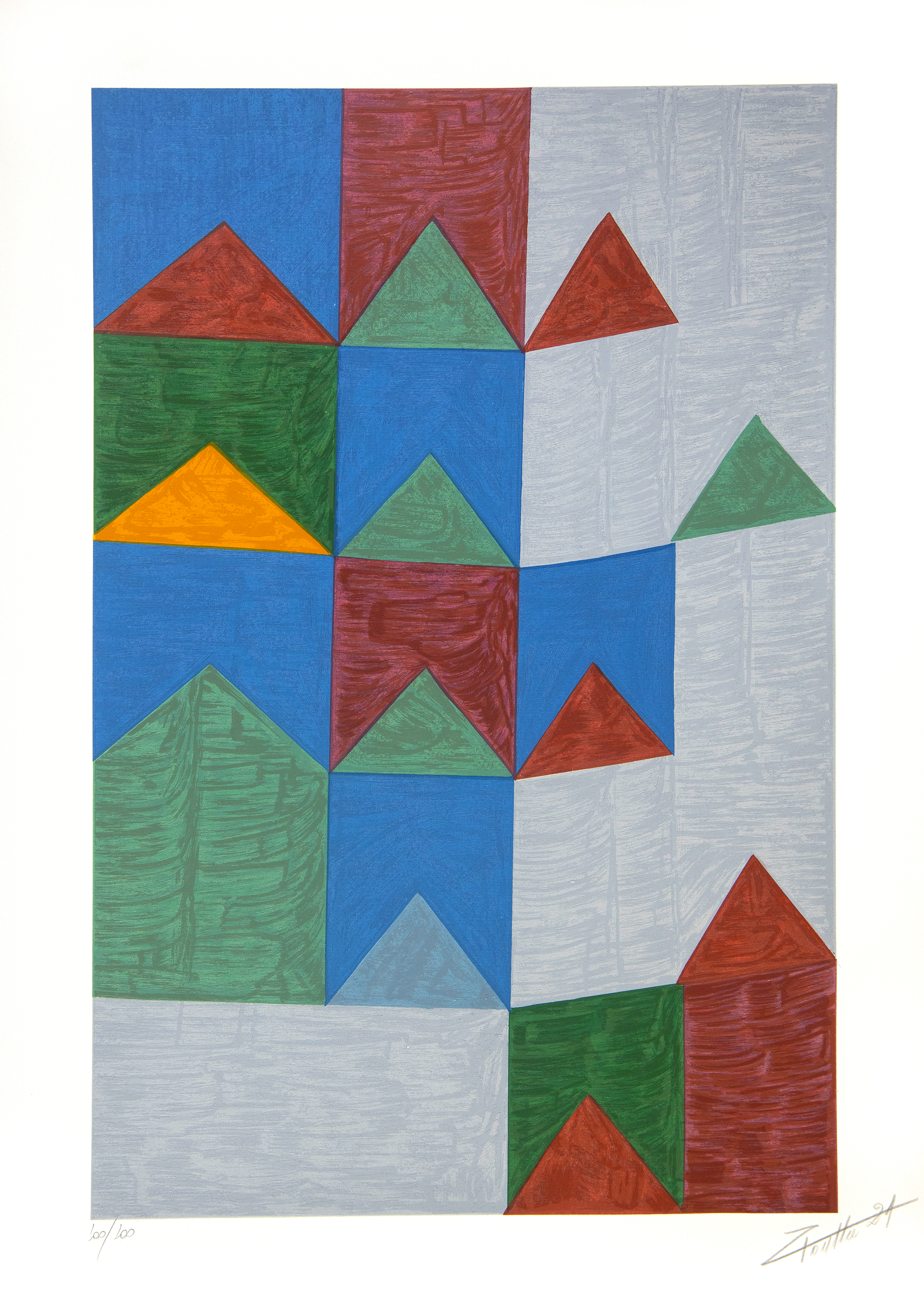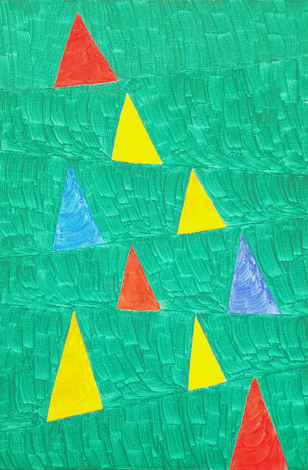 Sua obra atrai primeiro pelas cores e formas, depois para a sensação visual de que a pintura desloca-se do fundo.